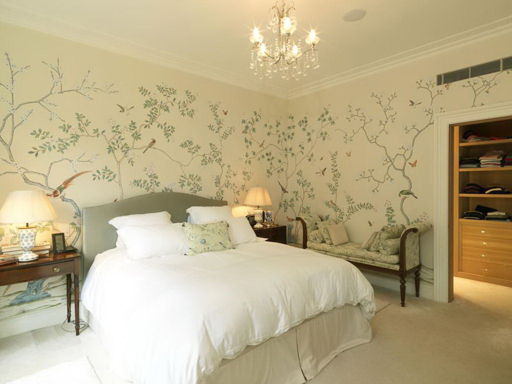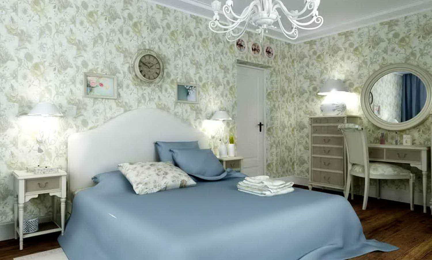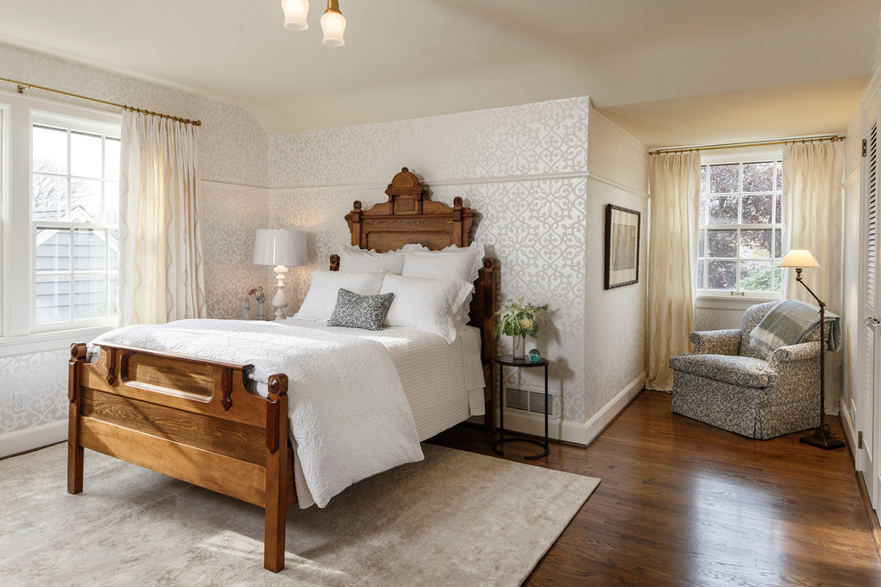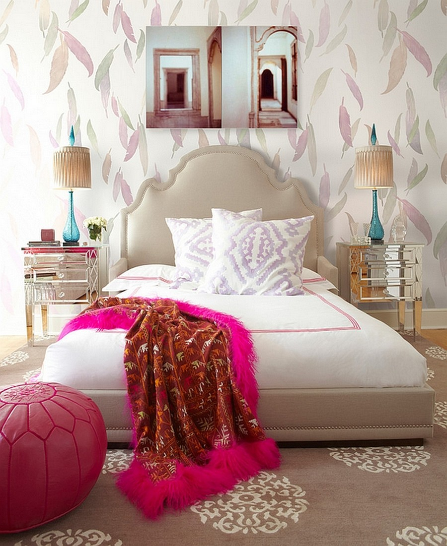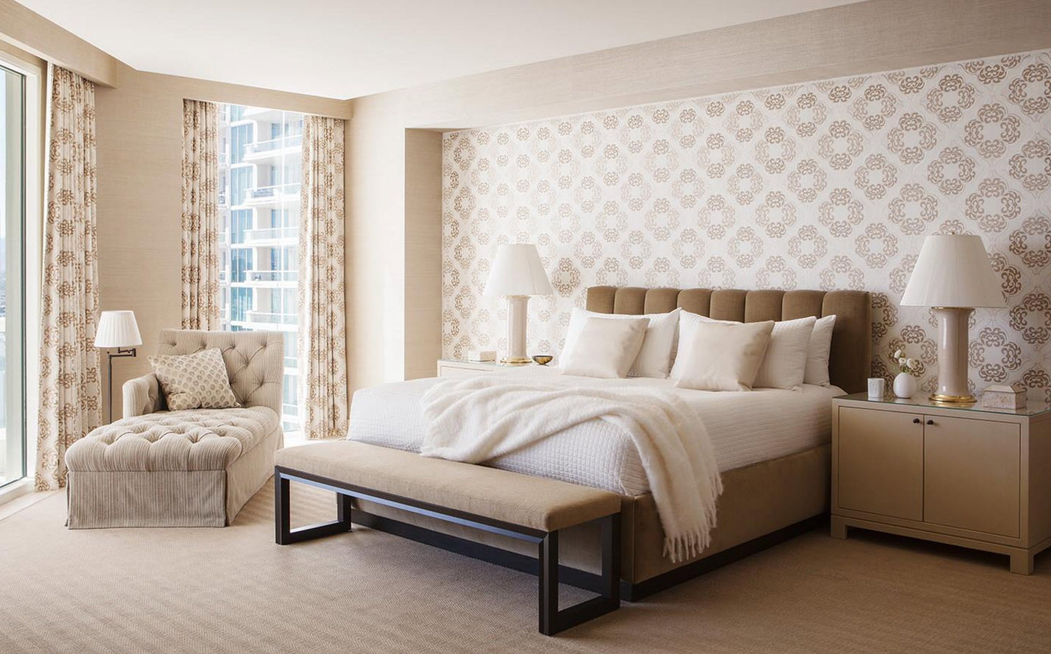 Cobrir as paredes do quarto com um padrão grande requer um pouco de refinamento para criar uma imagem geral holística. Faça certo: