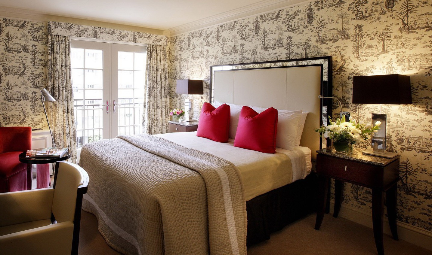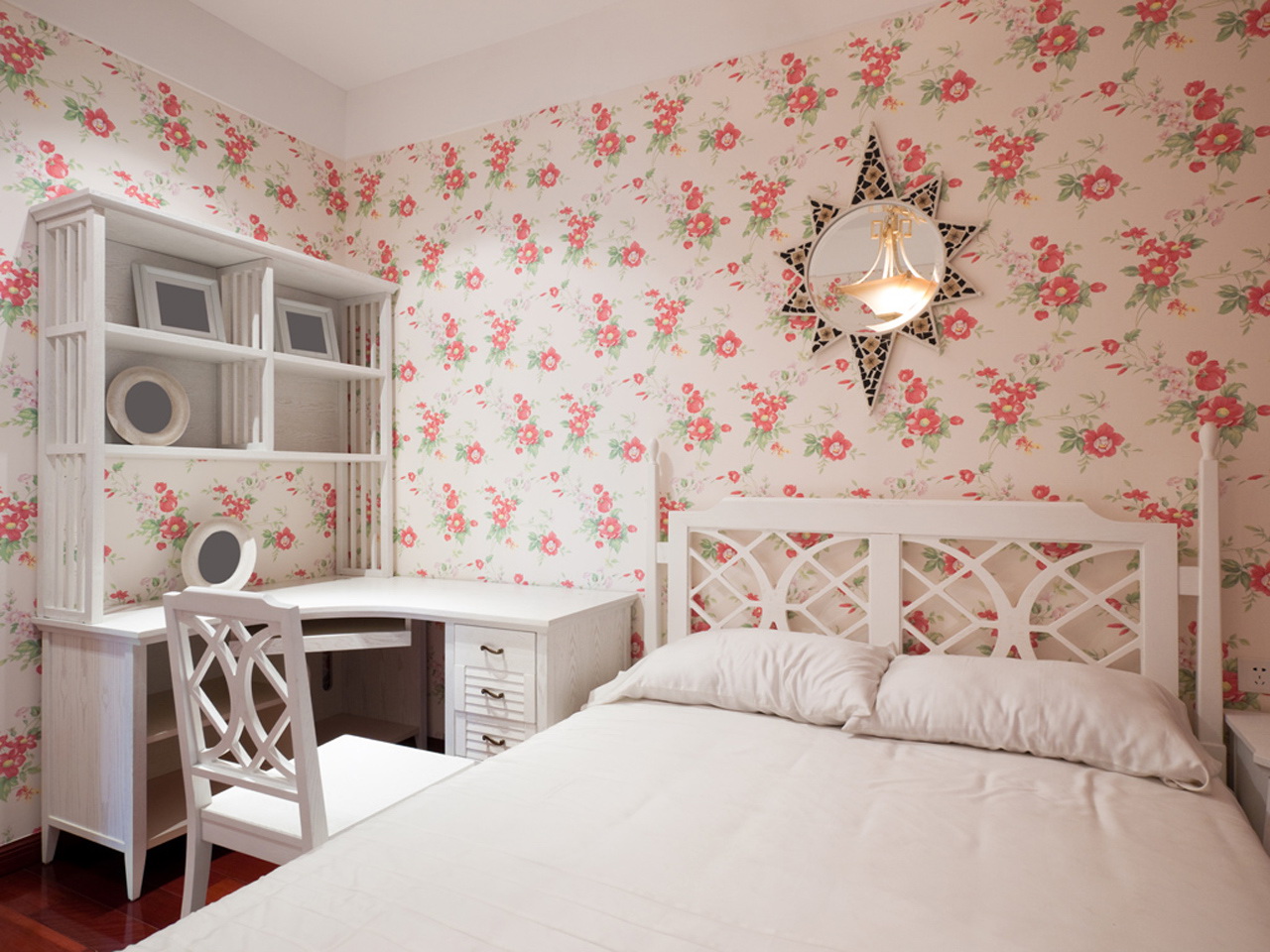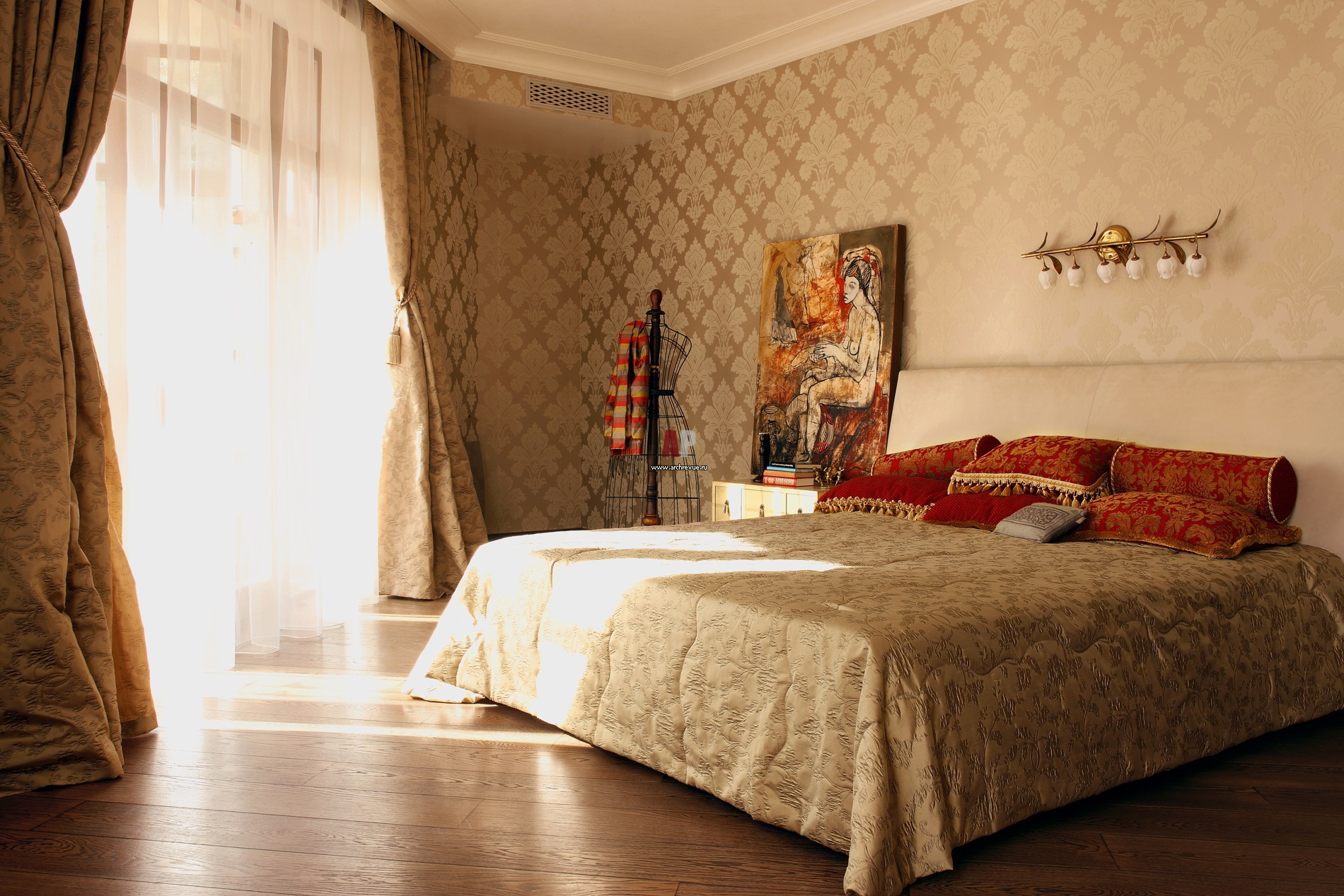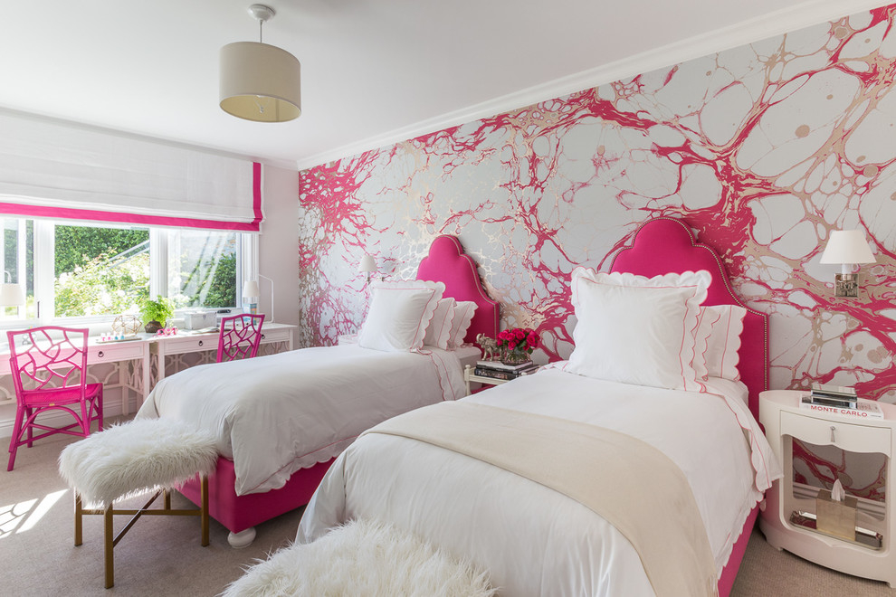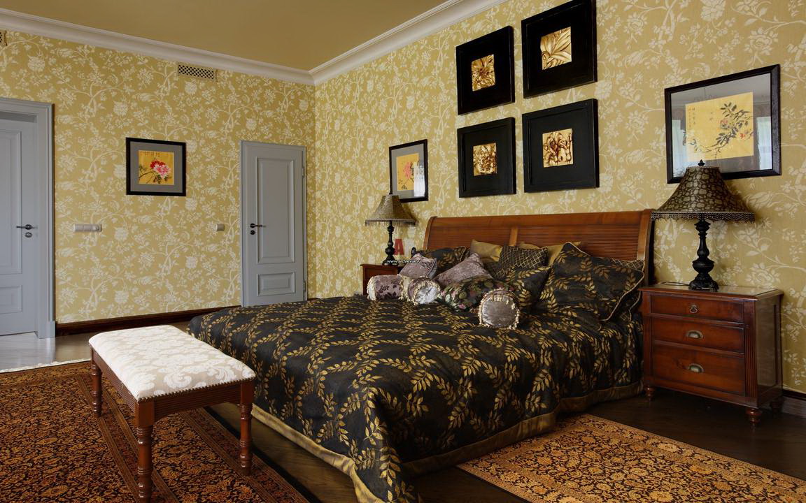 Cobrir as paredes do quarto com um padrão grande requer um pouco de refinamento para criar uma imagem geral holística. Faça certo:
