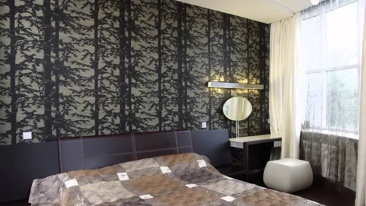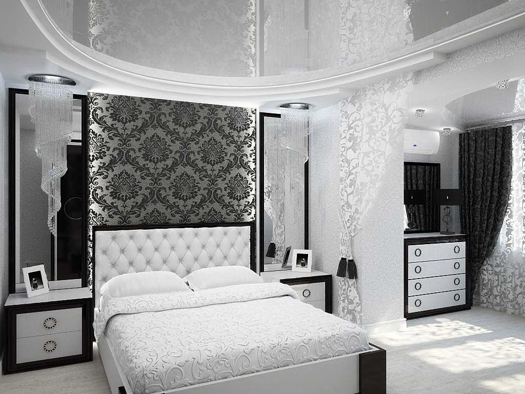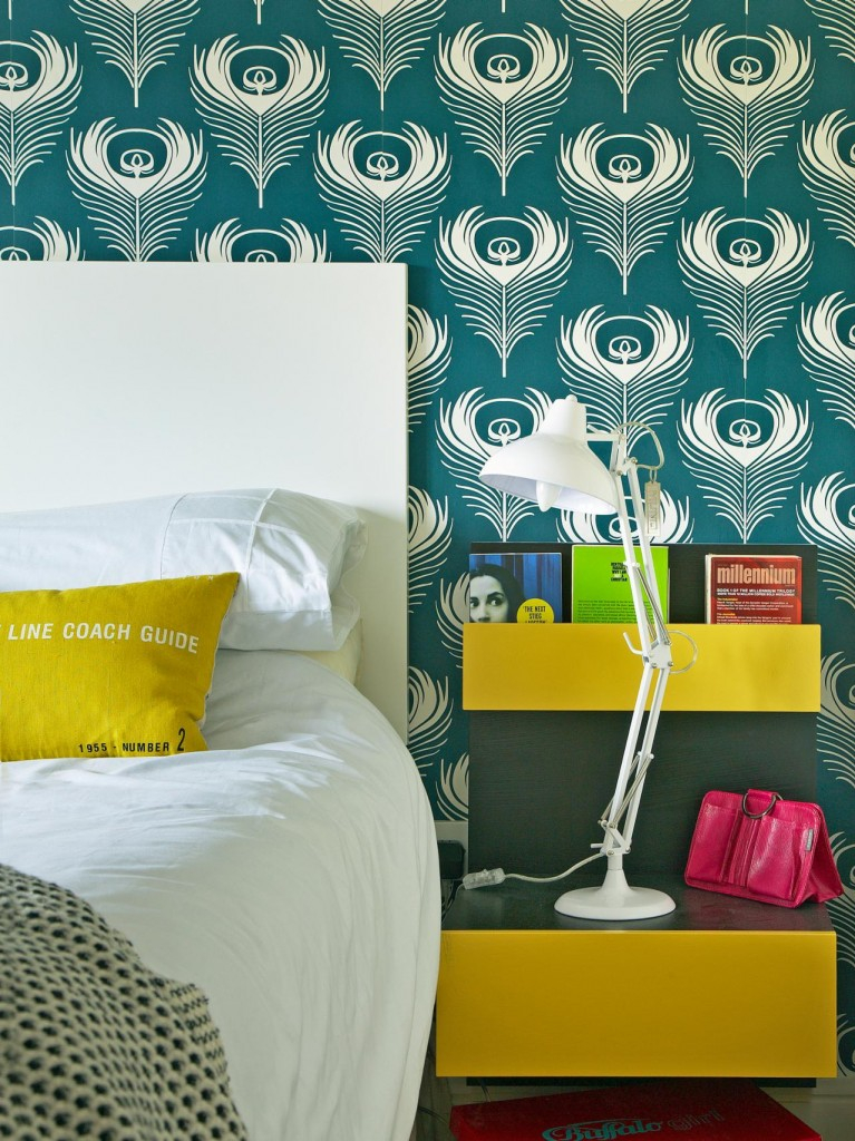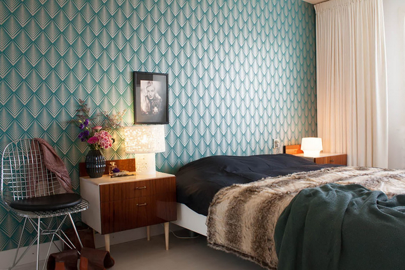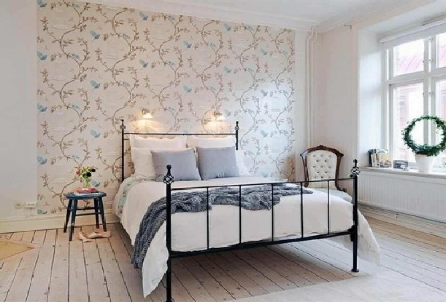 O uso de papéis de parede de design nos quartos em uma parede acentuada ainda sublinha o interior do quarto. Frequentemente, é uma parede ao lado da cama, decorada com um padrão incomum, o que a torna o foco central da sala.