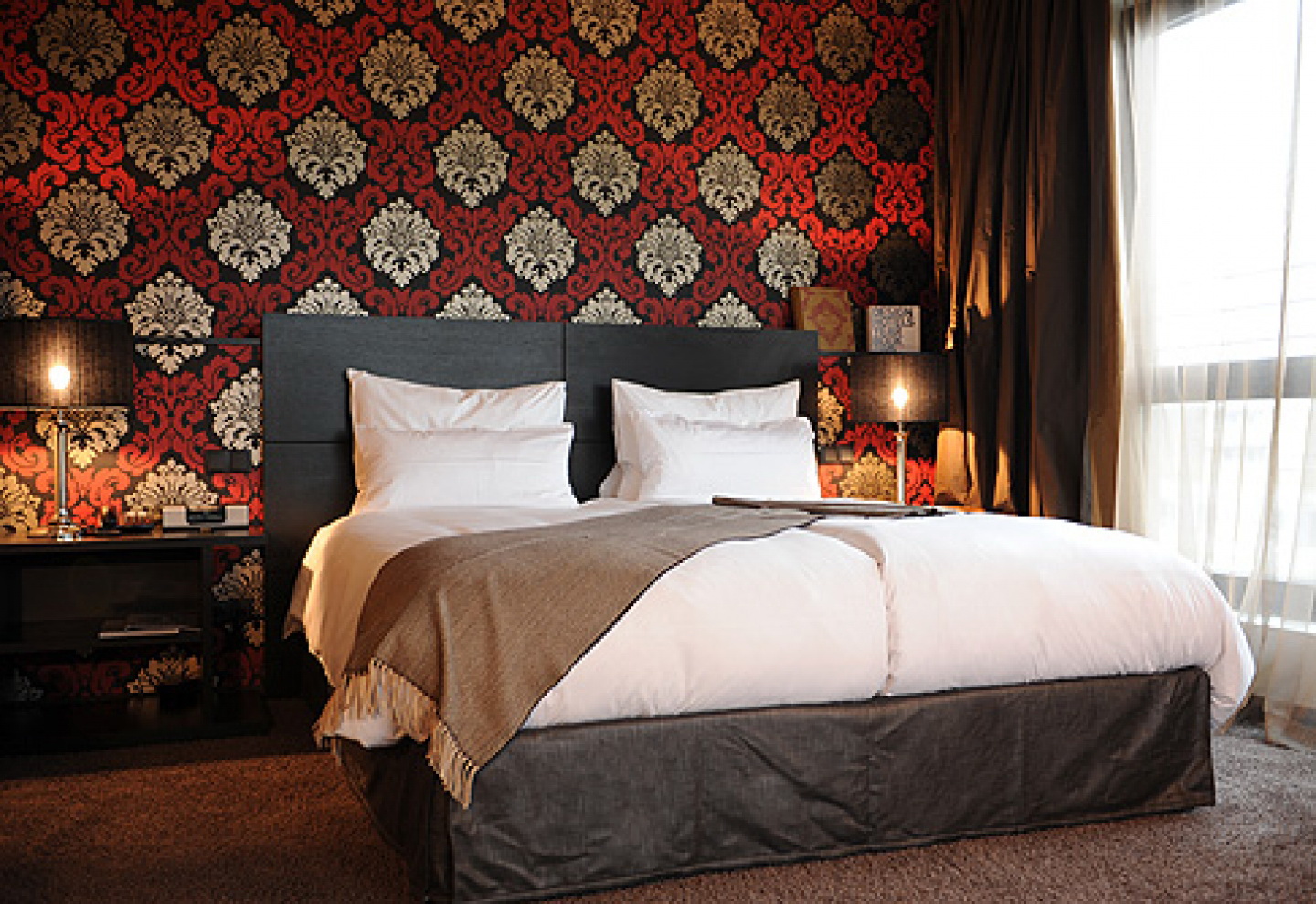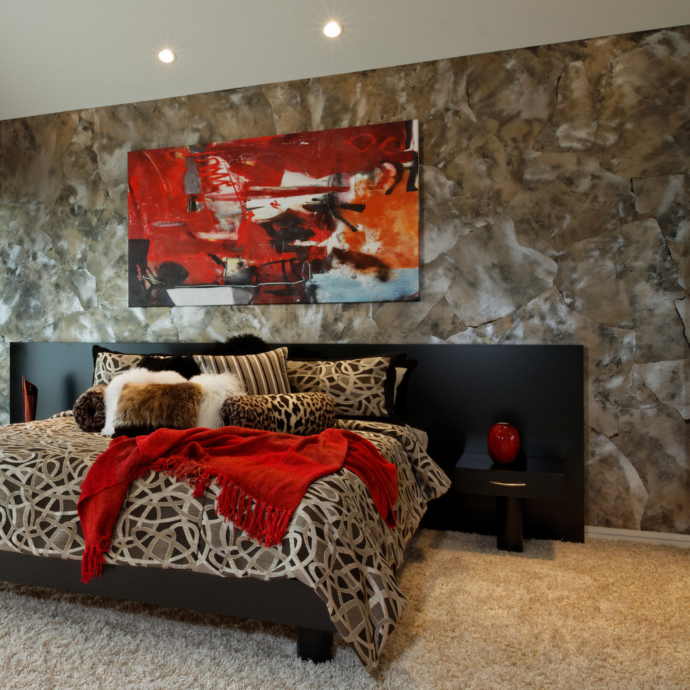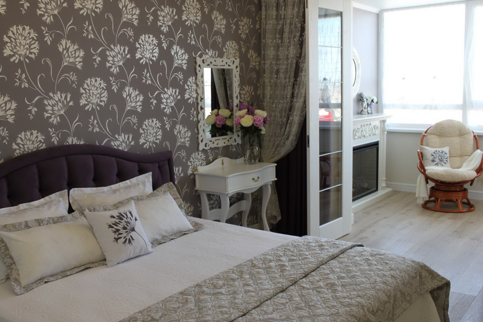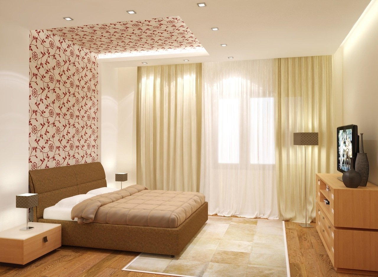 O uso de papéis de parede de design nos quartos em uma parede acentuada ainda sublinha o interior do quarto. Frequentemente, é uma parede ao lado da cama, decorada com um padrão incomum, o que a torna o foco central da sala.