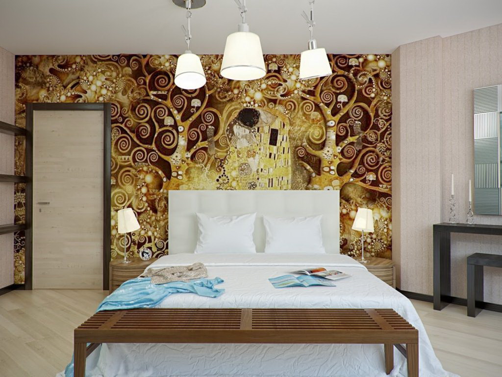 Baseie sua escolha em suas próprias preferências de estilo, como estilo barroco ou geométrico, abstrato ou nostálgico. Soluções interessantes feitas de madeira, pedra ou couro fino também são muito adequadas para paredes acentuadas. Motivos românticos e nostálgicos sempre serão populares em boudoirs.