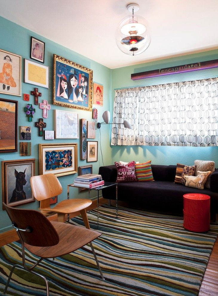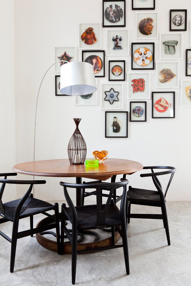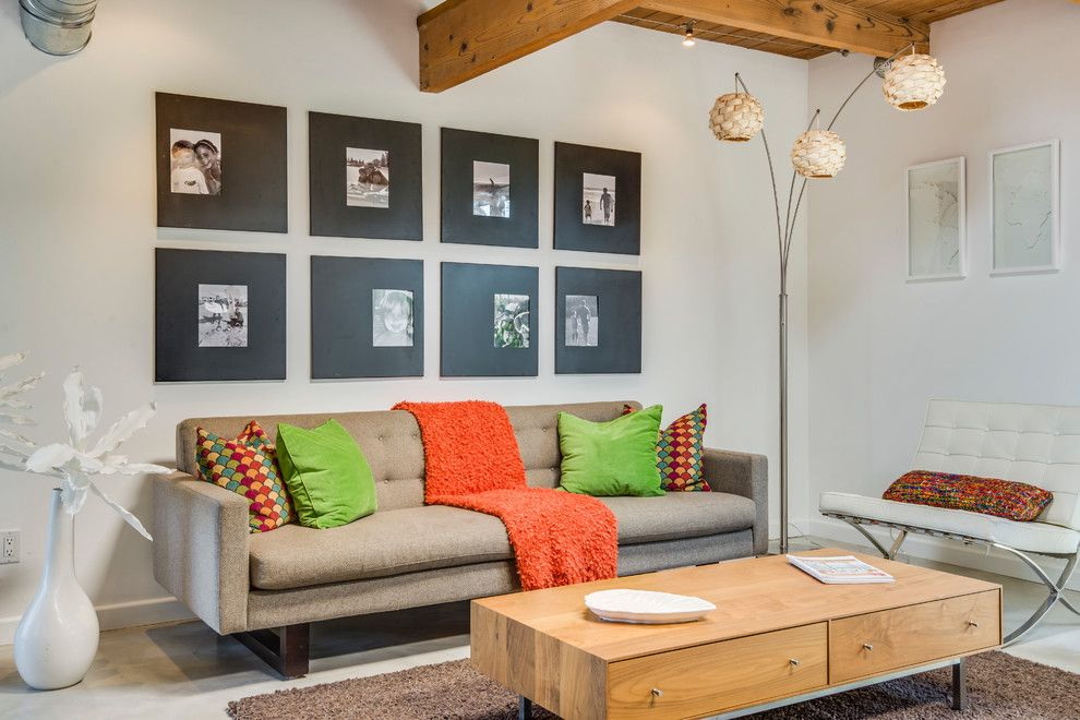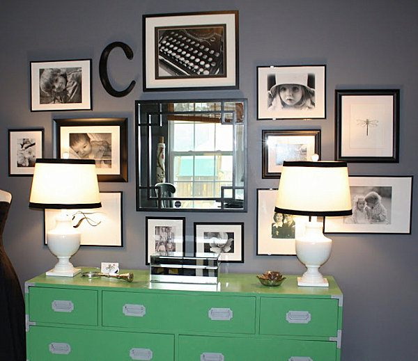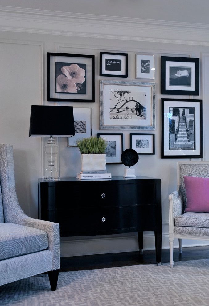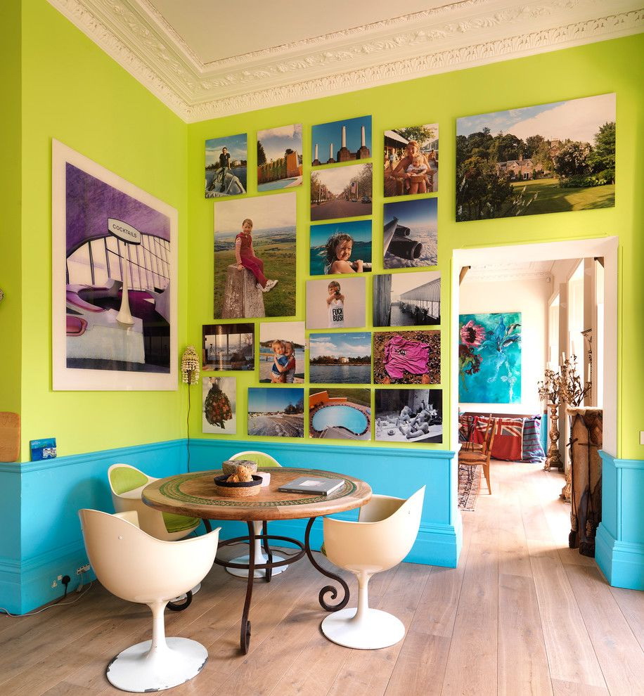 Perfeitamente carrega a sala com humor colocando fotos em preto e branco em um fundo monofônico brilhante. E cada foto deve ter um fundo diferente: