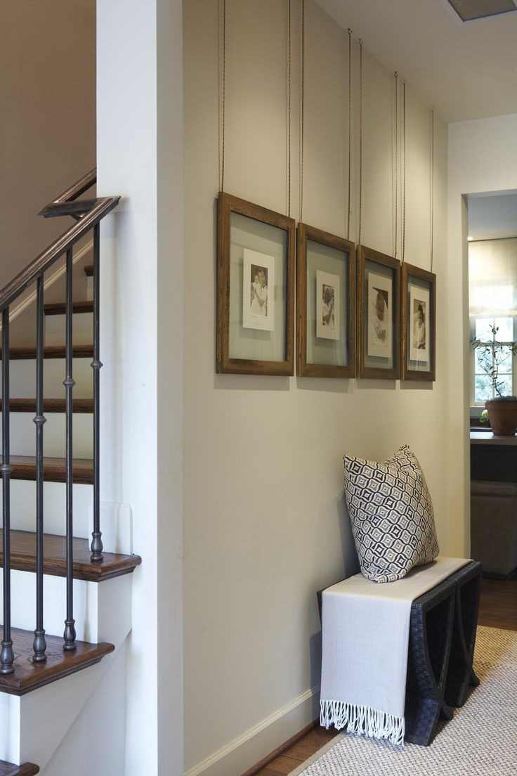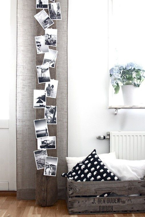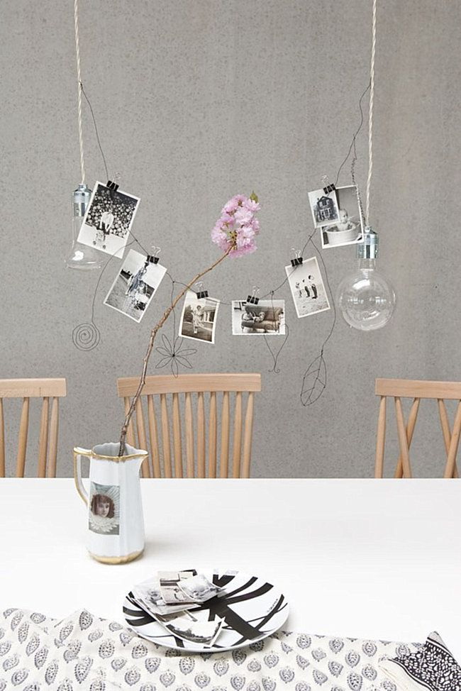 Você pode tentar pendurar fotos em prendedores de roupa não em uma corda horizontal, mas em uma vertical, que não parece menos original. Outros elementos decorativos podem ser colocados entre eles.