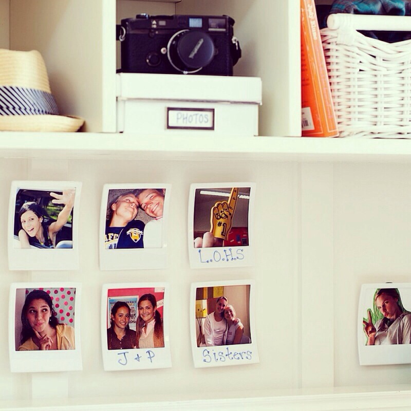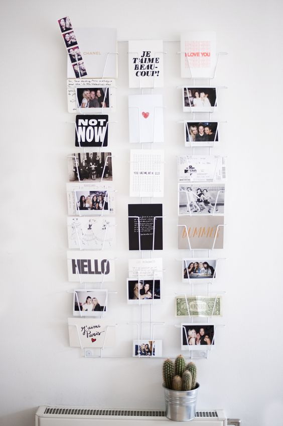 - ideia criativa - colando fotos na parede dentro de um rack aberto;