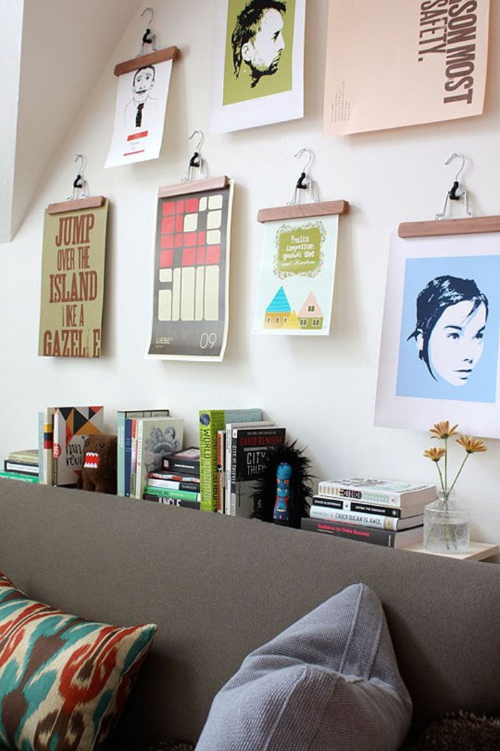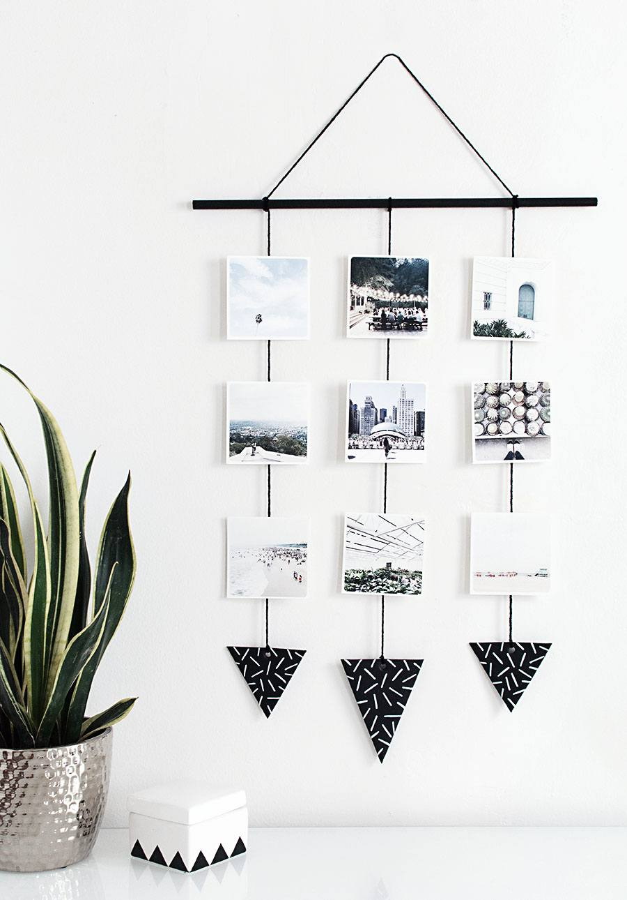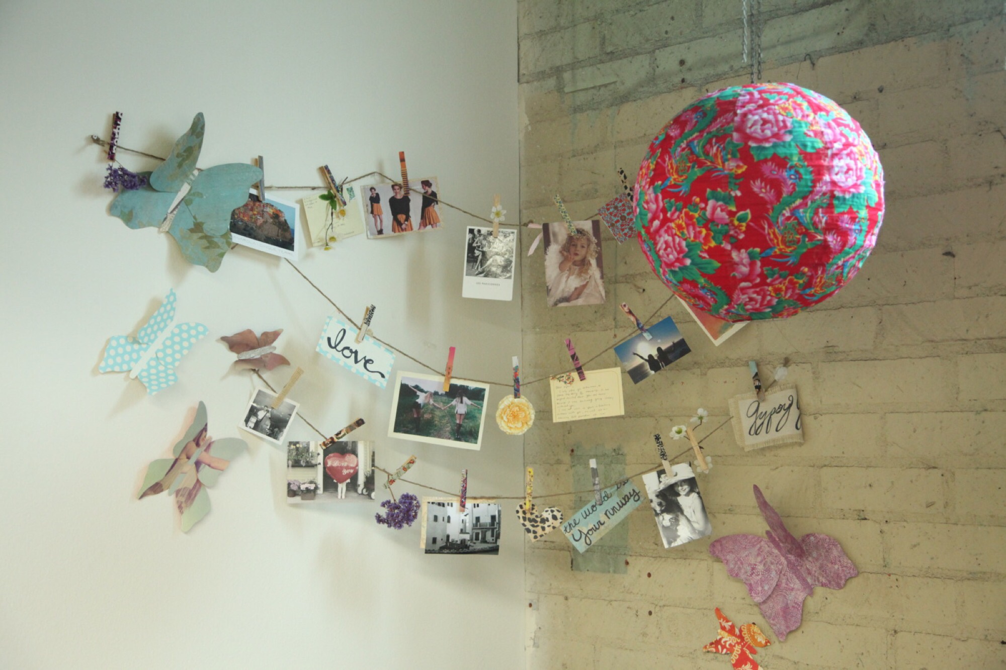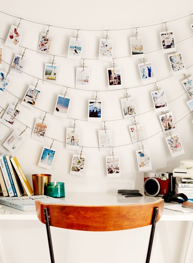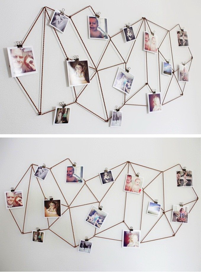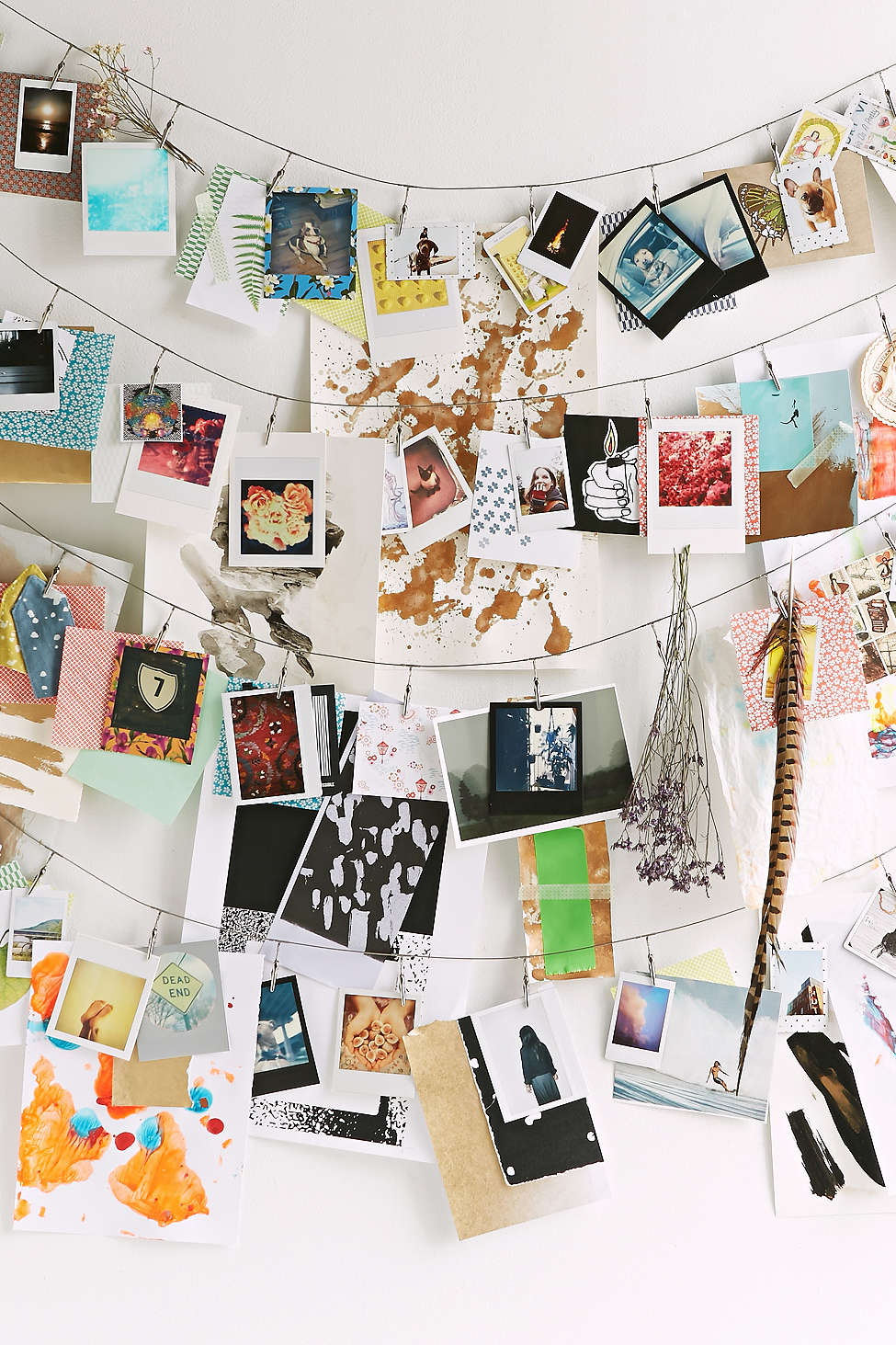 - pendurando fotos com prendedores de roupa no varal, penduradas na parede.