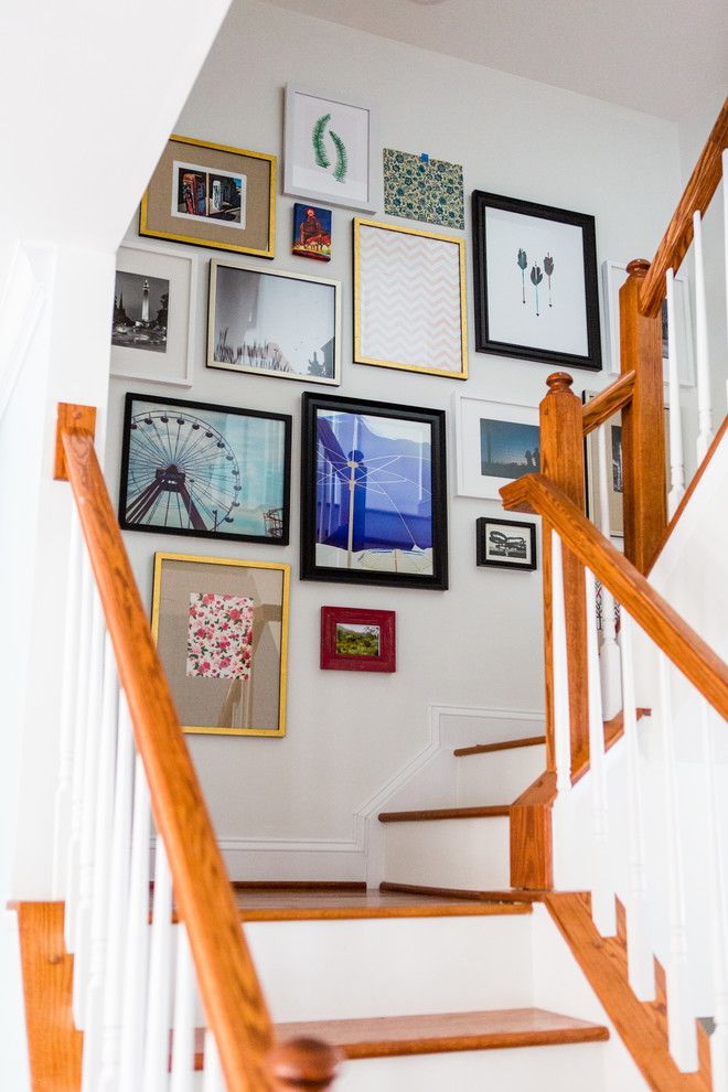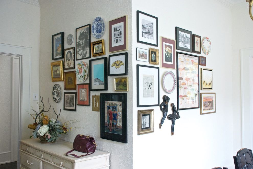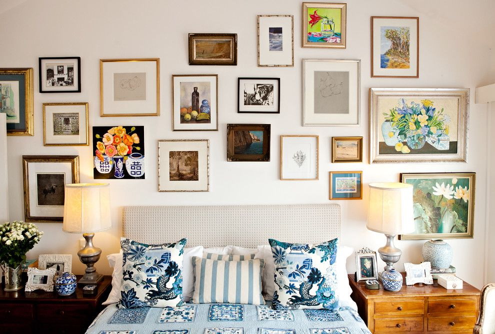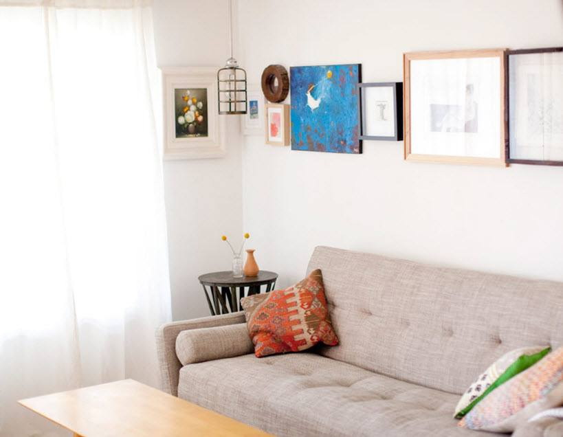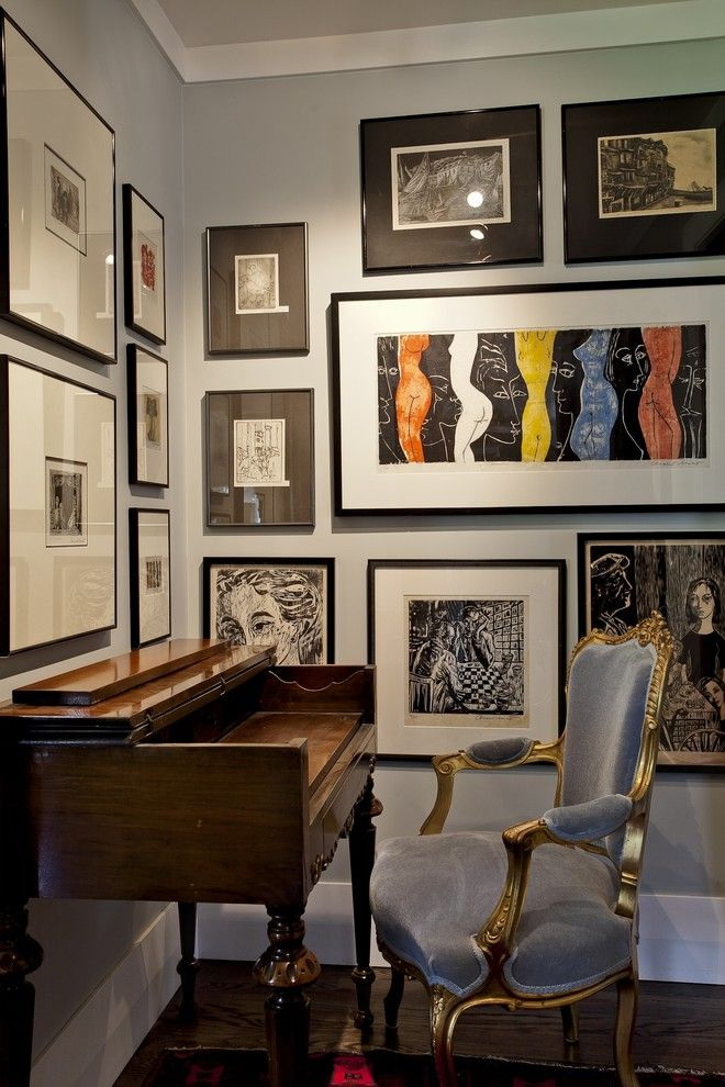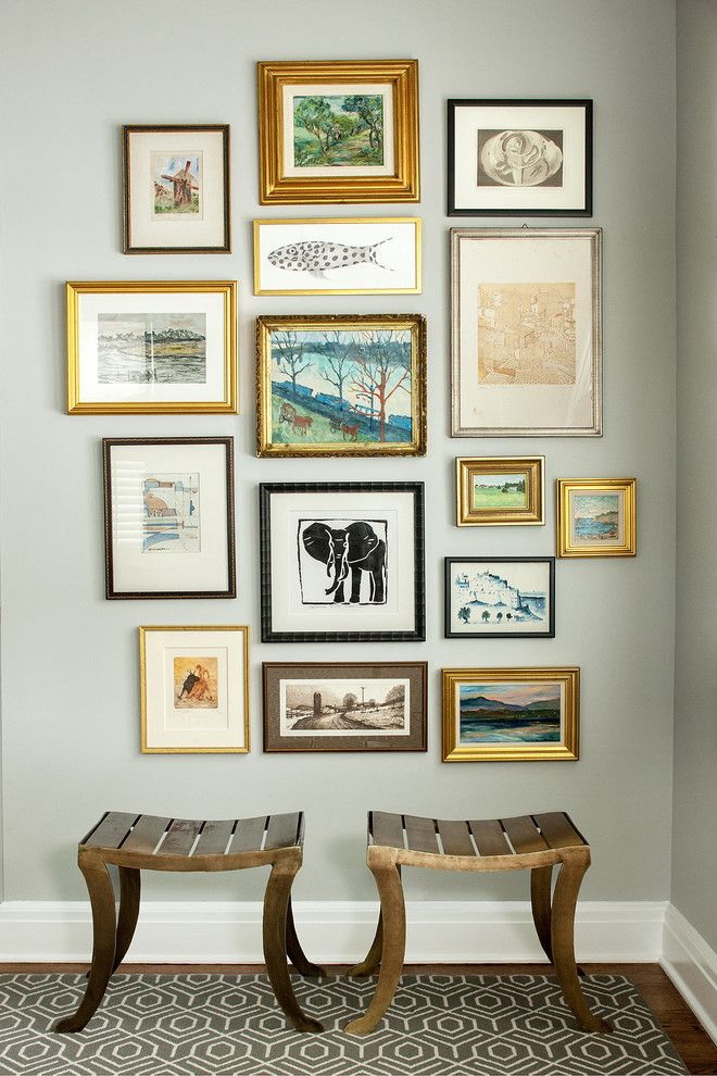 - Use uma variedade de quadros em um estilo para decorar a parede. Esta opção permite continuar a adicionar constantemente novas imagens à composição.