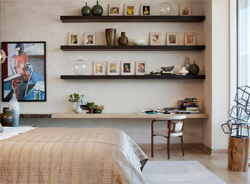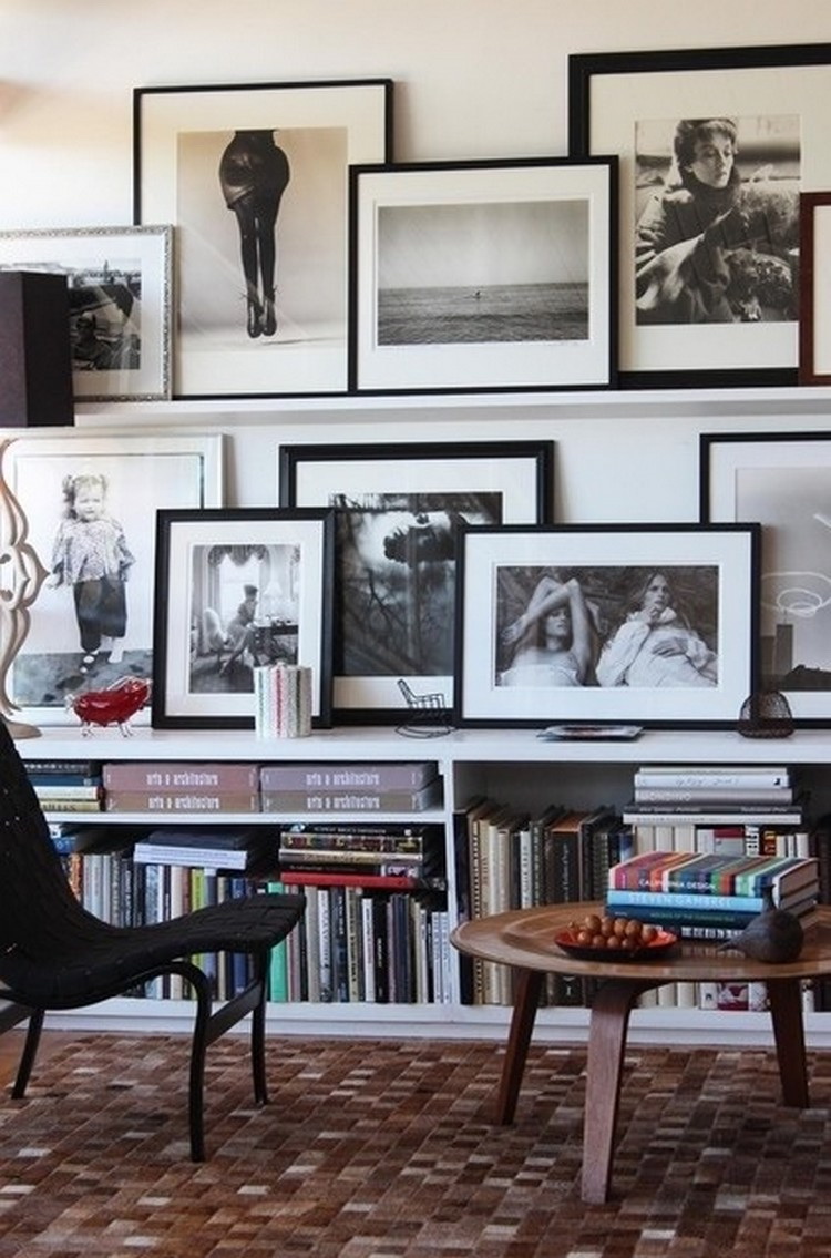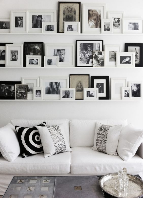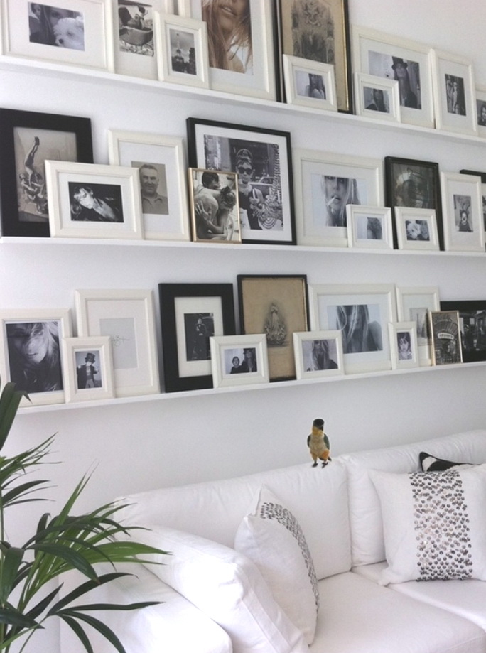 - Arranjo de fotos em quadros em várias prateleiras em uma parede - uma combinação de beleza e praticidade.