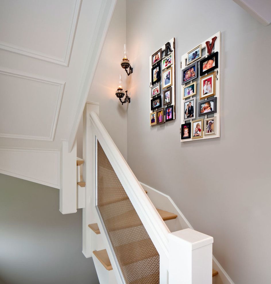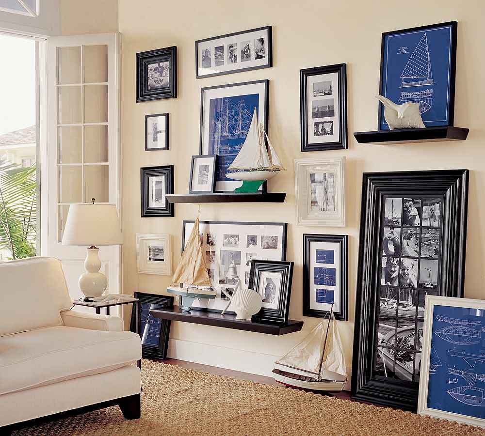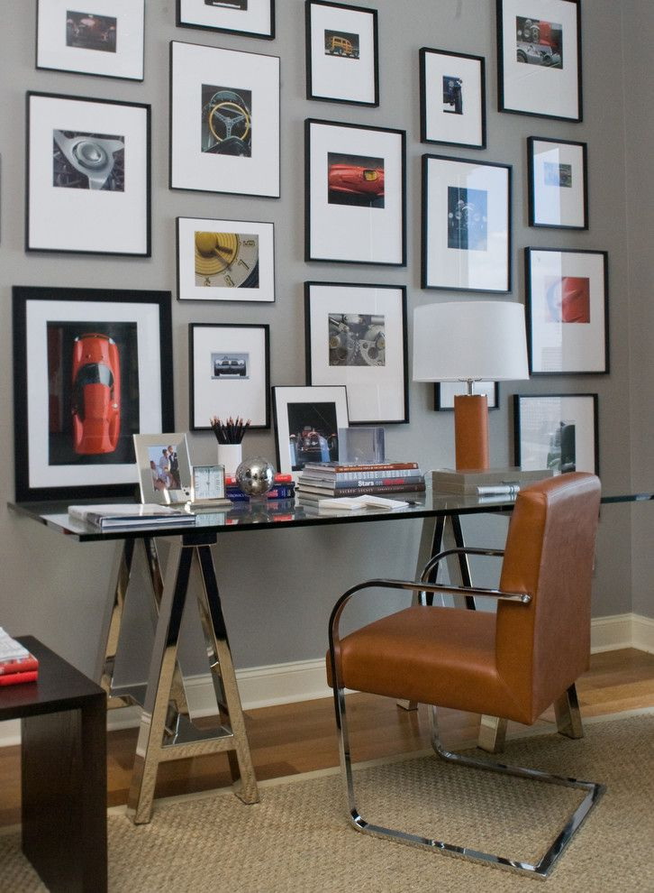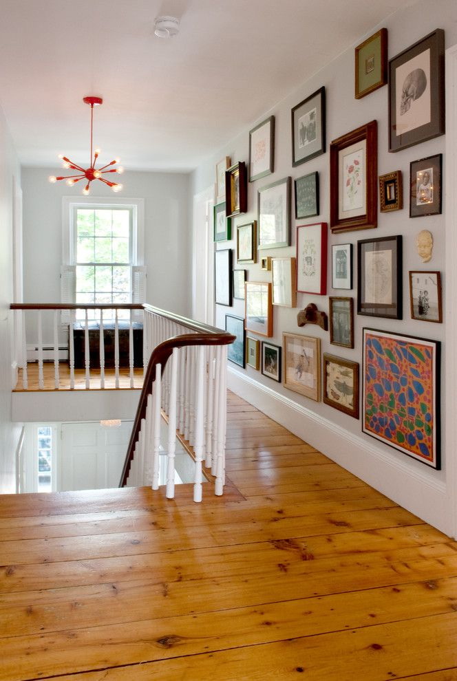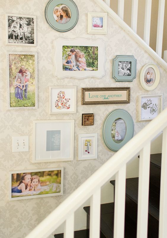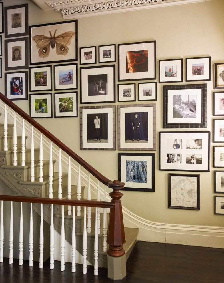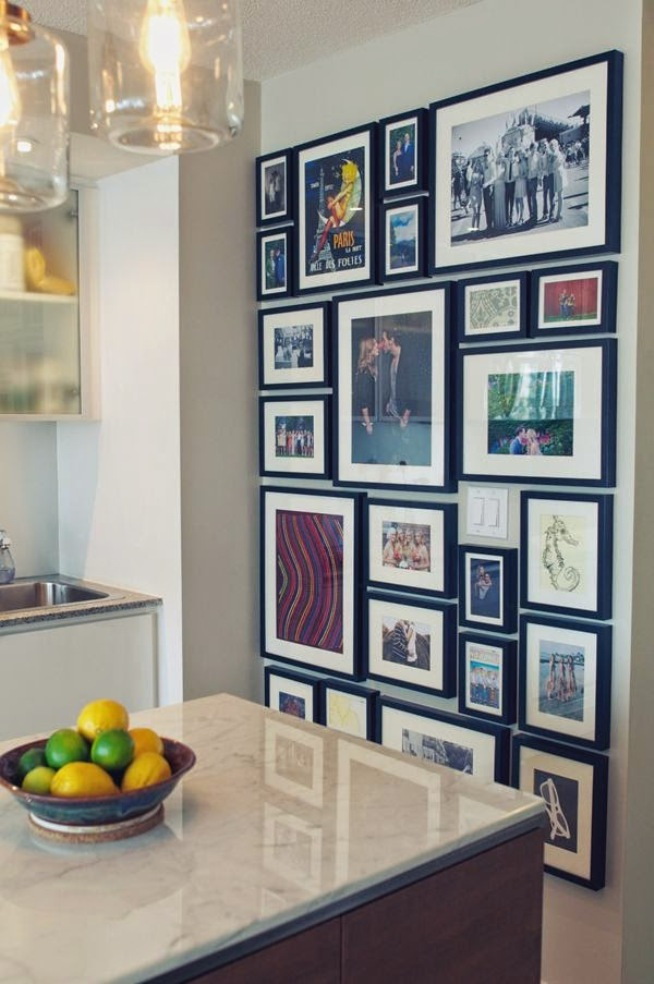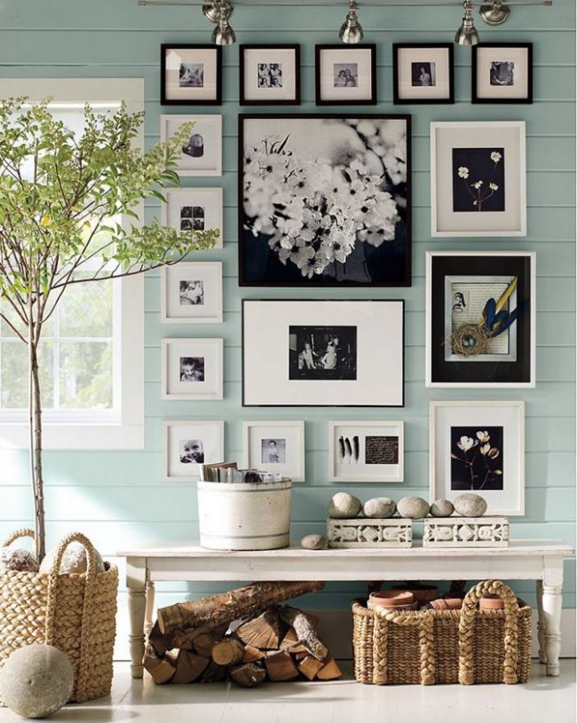 - cria uma sensação da galeria colocando na parede fotos de diferentes formas e tamanhos em molduras de cores diferentes. É necessário cuidadosamente combiná-los uns com os outros para evitar confusão excessiva.