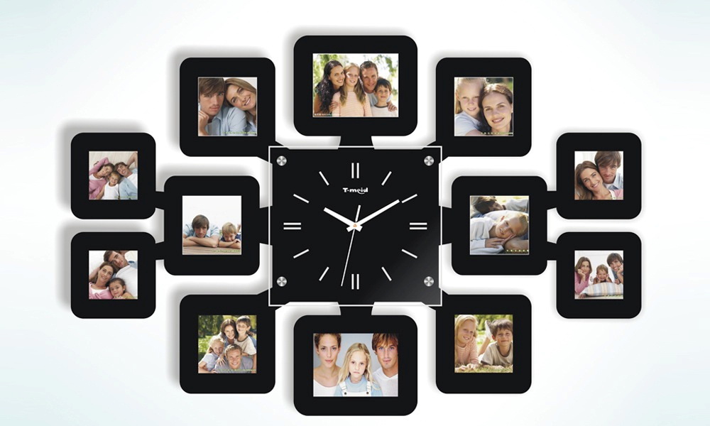 Você também pode colocar fotos de maneiras diferentes, por exemplo, selecione 3, 6, 9, 12 em fotos grandes em relógios imaginários e escolha uma foto menor para outras. Você pode pegar o mesmo tamanho e formato das imagens, observar a simetria dos números verticais 6 e 12, horizontal 9 e 3. O resto fica a seu critério.