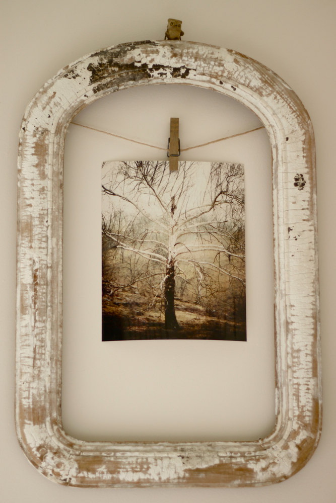 - Uma moldura grande, que pode permanecer de uma foto antiga ou de um espelho, é adequada para decoração. Dentro dele, os fios são esticados, sobre eles, fotos de qualquer tamanho que você queira se agarrar com prendedores de roupa.