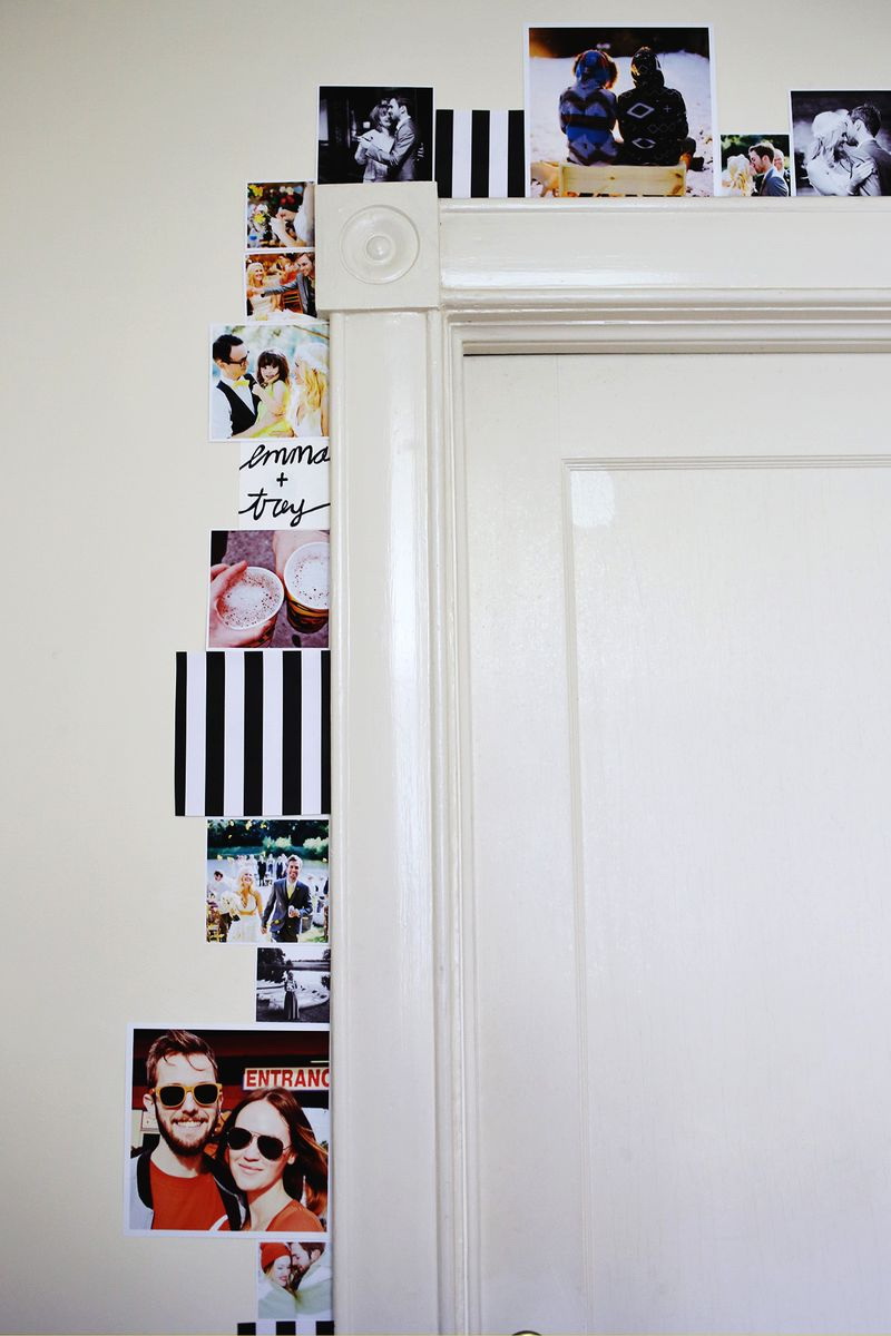 - As fotos podem ser montadas diretamente na parede usando fita dupla-face. Graças a esta técnica, é possível criar absolutamente qualquer ornamento de fotografias, colocá-los em qualquer posição, até mesmo cortá-los com uma parede sólida. Fita dupla face irá segurar os snaps de forma segura.