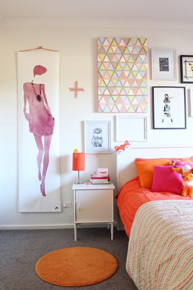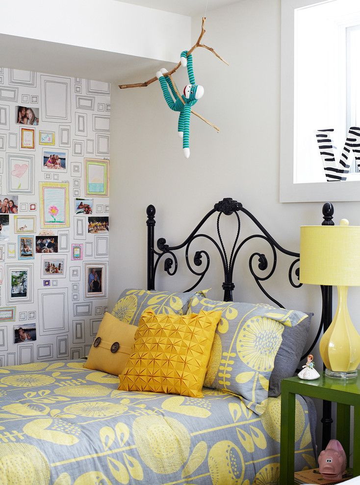- Na parede perto do sofá você pode criar uma colagem colorida brilhante. As imagens são complementadas com pequenas imagens favoritas da criança. Você também pode usar seu trabalho e artesanato, por exemplo, desenhos, bordados, uma coleção de borboletas.