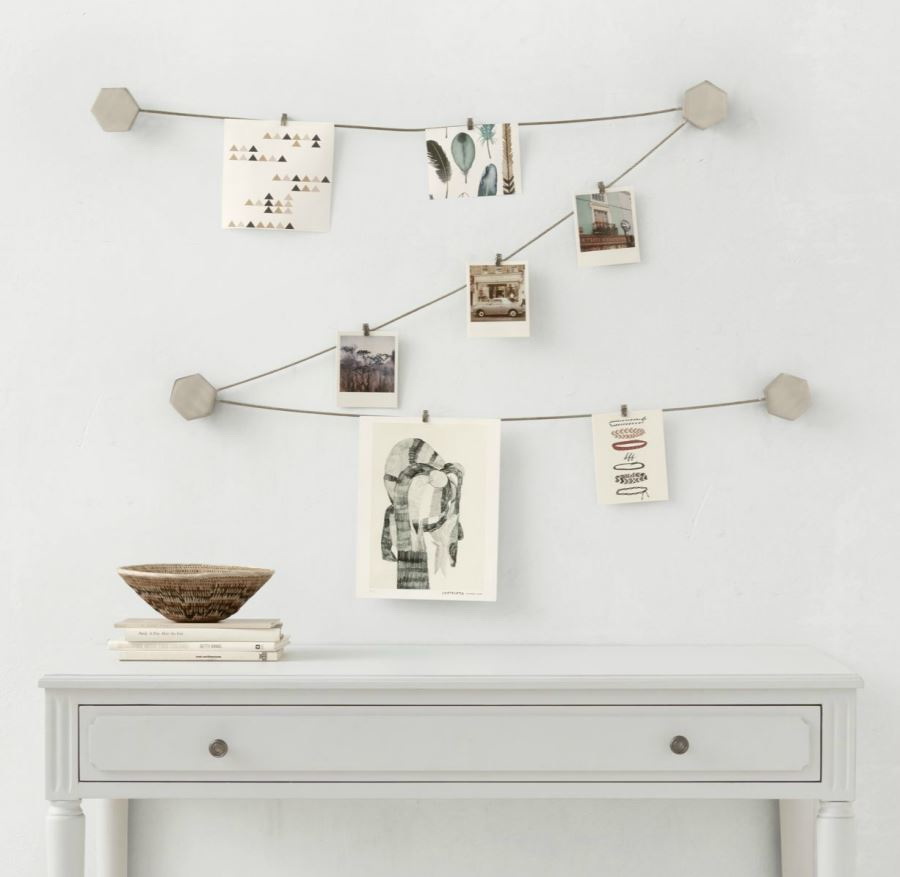 - fotos em fios - ganchos especiais são anexados às fotos. Para sublinhar o plano de fundo, você pode colocá-los em folhas brancas idênticas e, em seguida, as cartas devem ter a mesma forma. Fios, arame, corda, fios são presos a quais clipes para cortinas segurando uma foto;
