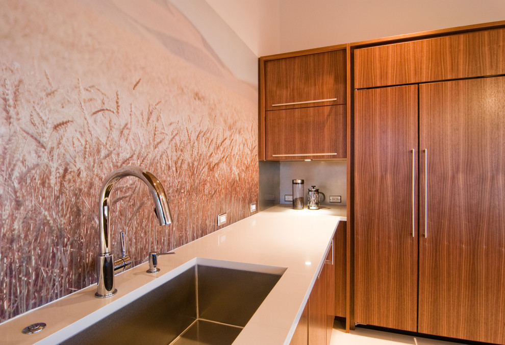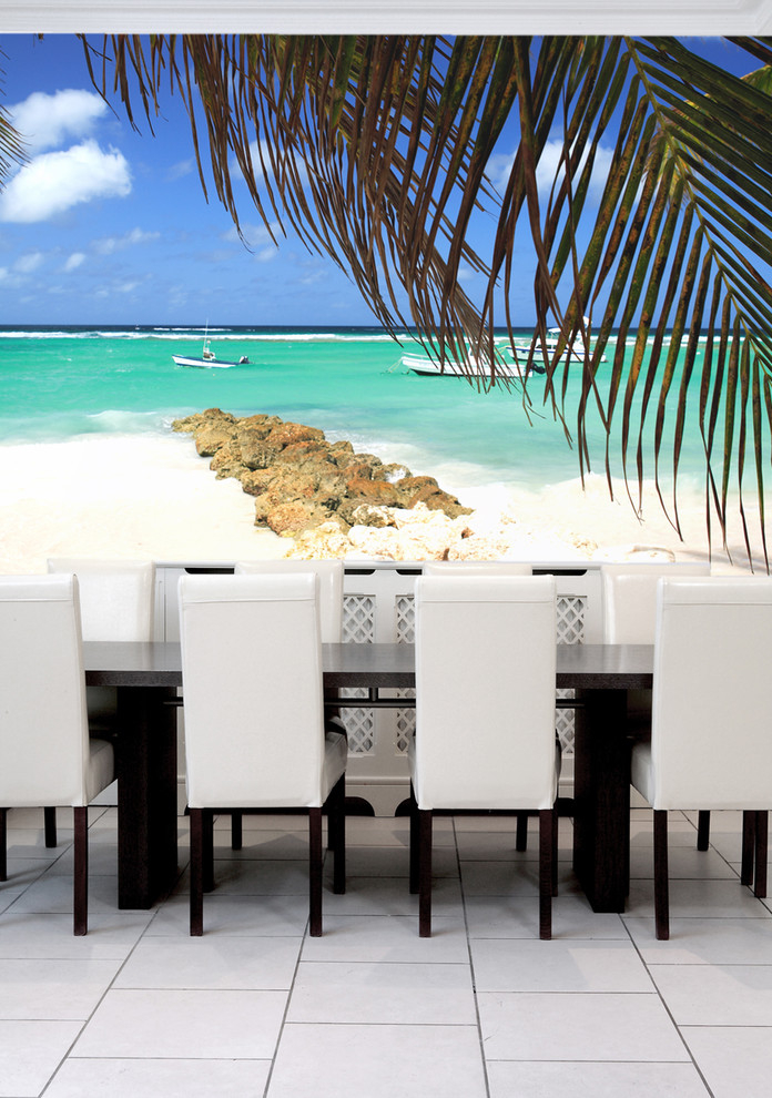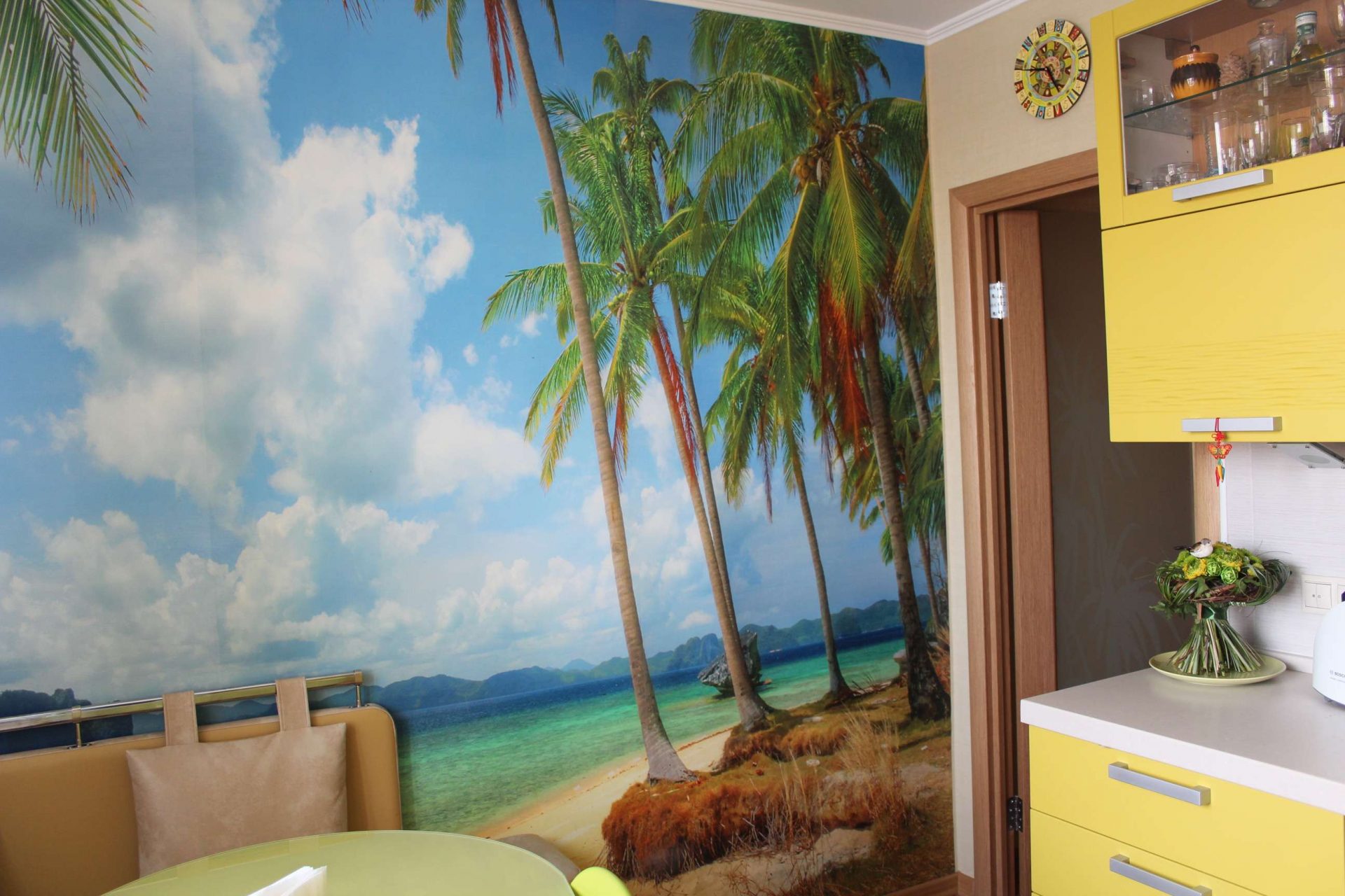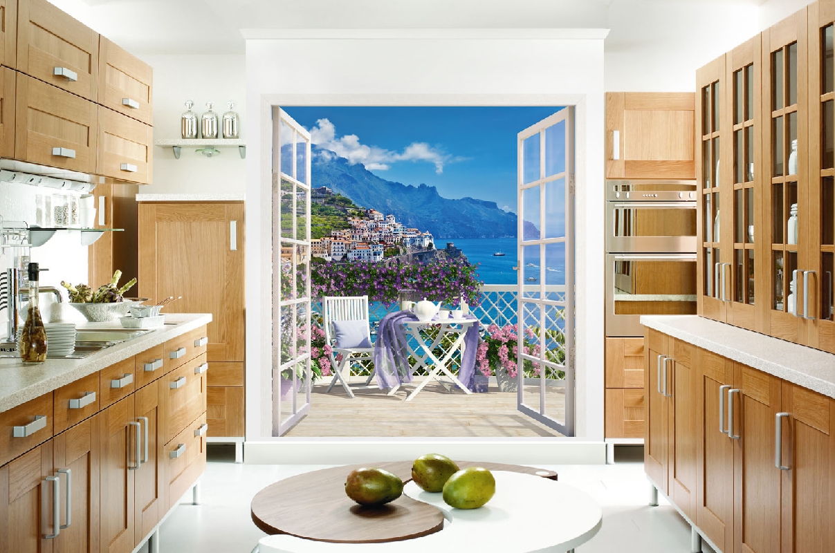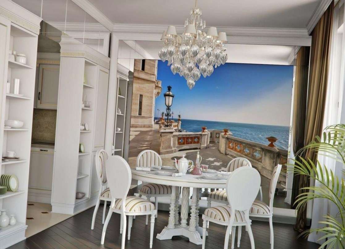 A contemplação do elemento água em todas as suas manifestações traz paz à pessoa, dizem que uma das coisas que você pode assistir para sempre é o fluxo de água. Photowall-paper em uma parede com o mar brilhante, expressivo, portanto, vai atender não muito longe para cada cozinha. Normalmente, eles parecem apropriados quando a sala é feita em áreas de design como o minimalismo, o Mediterrâneo.
