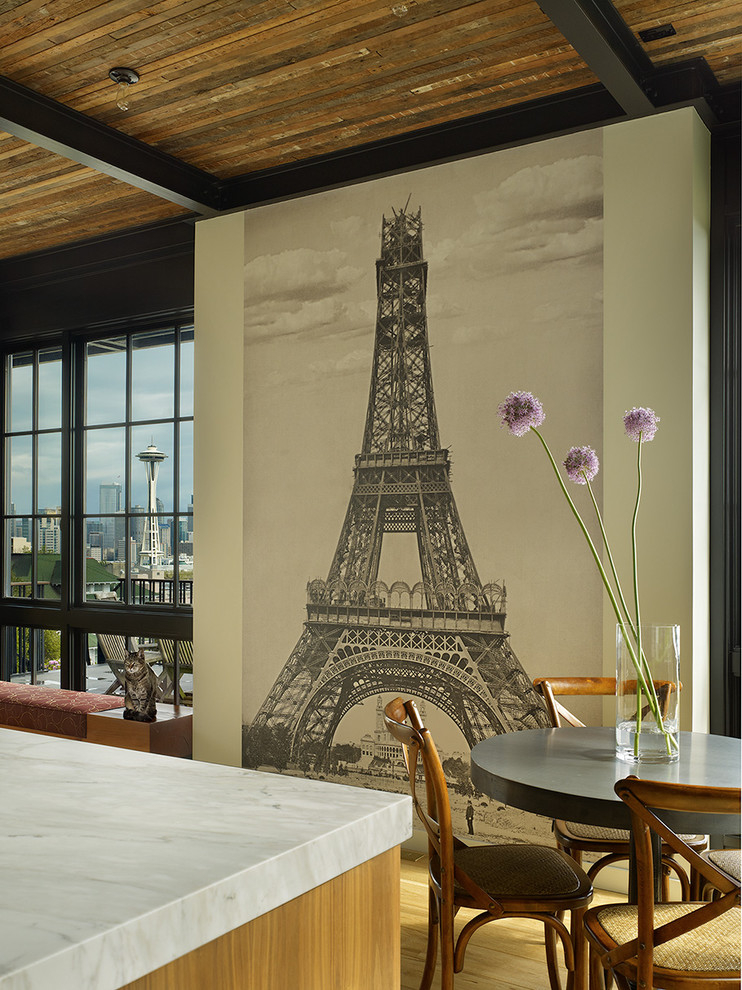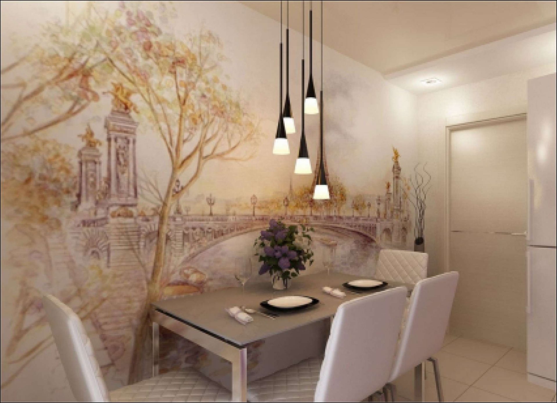 Charme francês no design de qualquer sala lhe dá um romance, sofisticação. Papel fotográfico com os elementos representados de Paris ajudará a olhar para lá onde você já visitou ou, talvez, enquanto apenas você pretende visitar. E você pode fazer isso todas as vezes, indo para a cozinha, tomando uma xícara de café da manhã ou um jantar com sua amada.