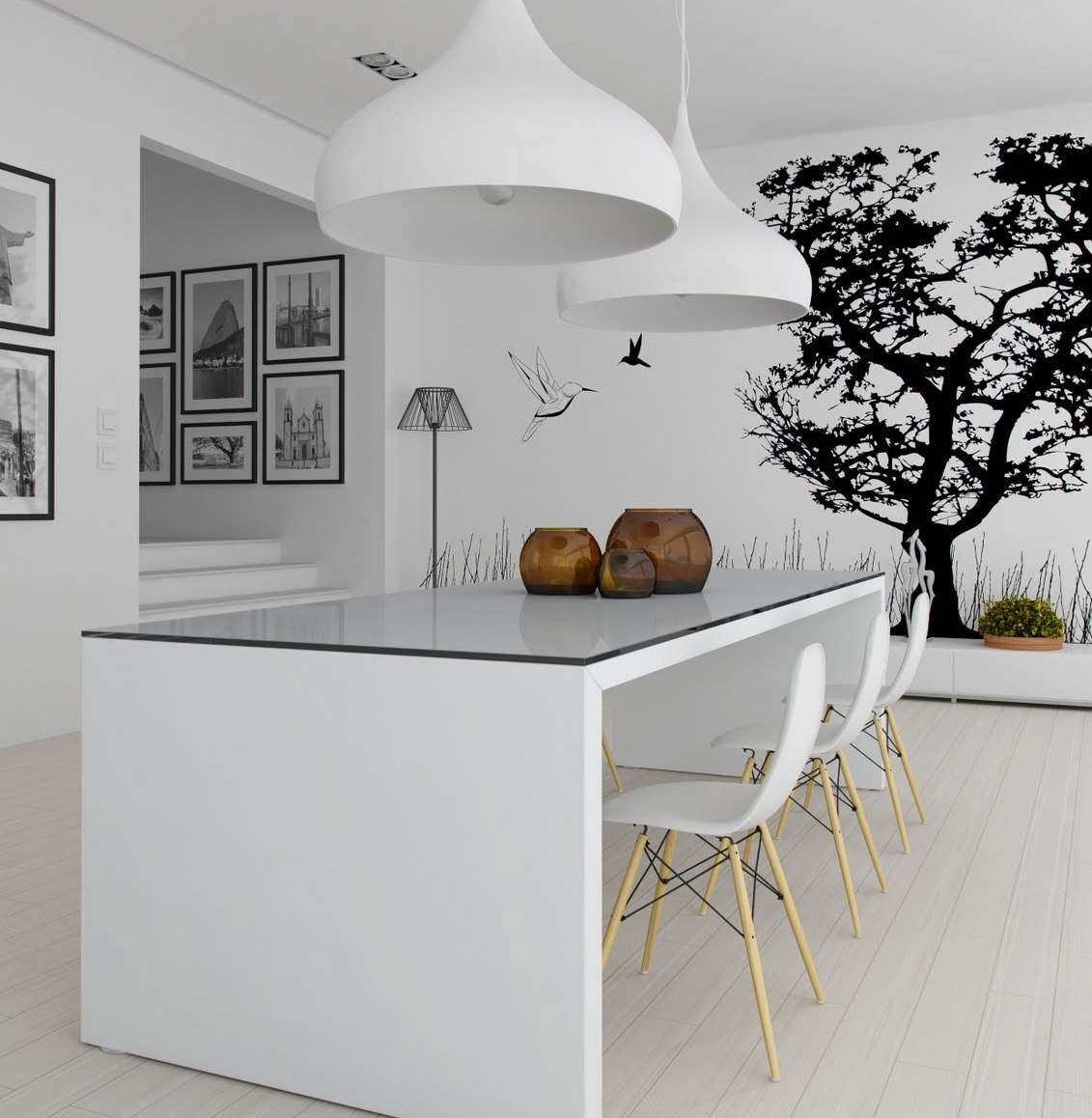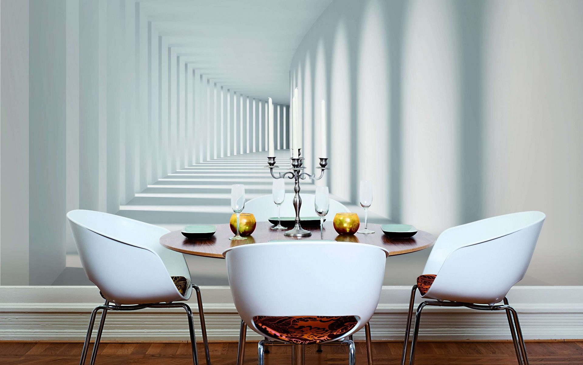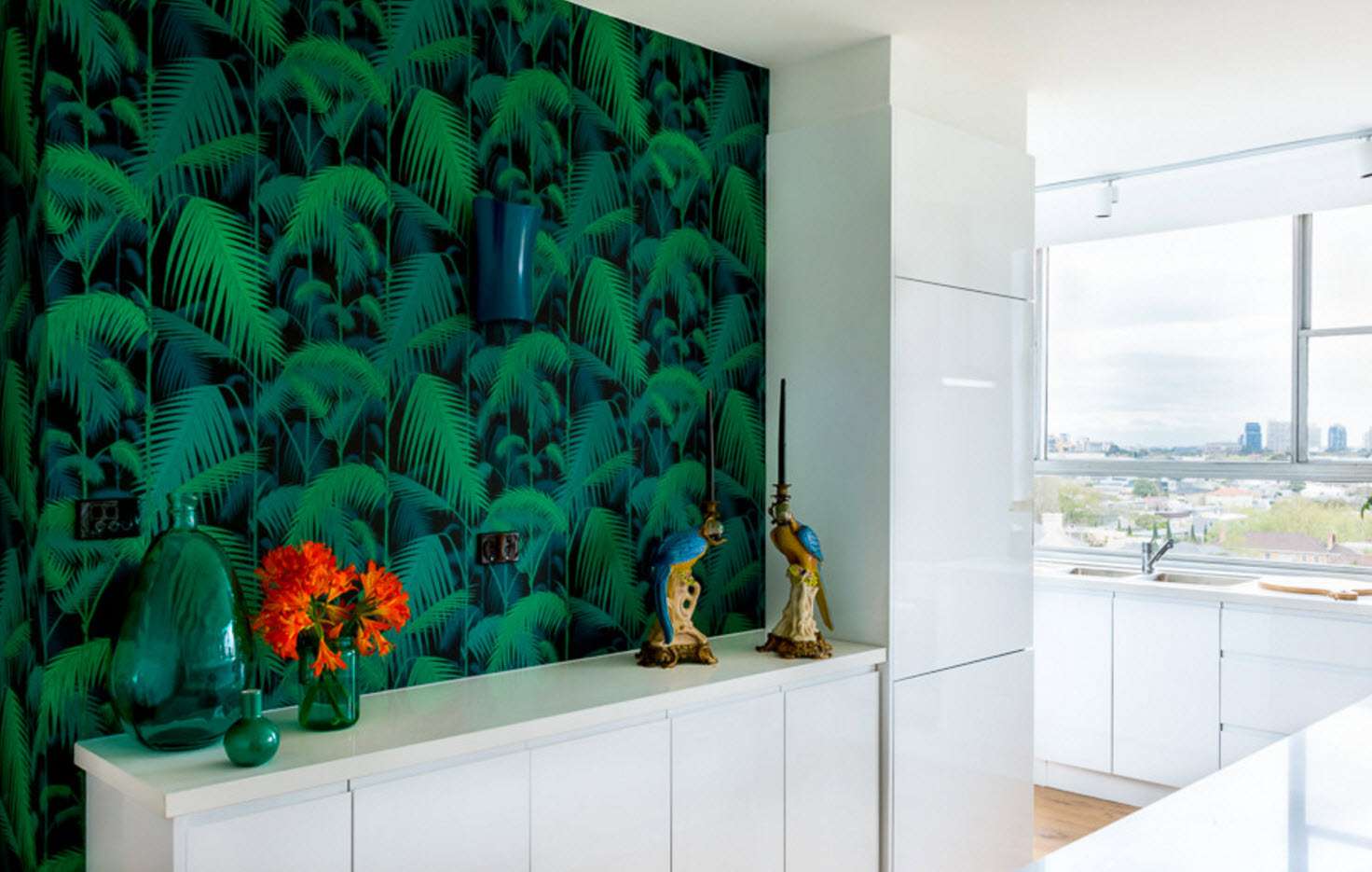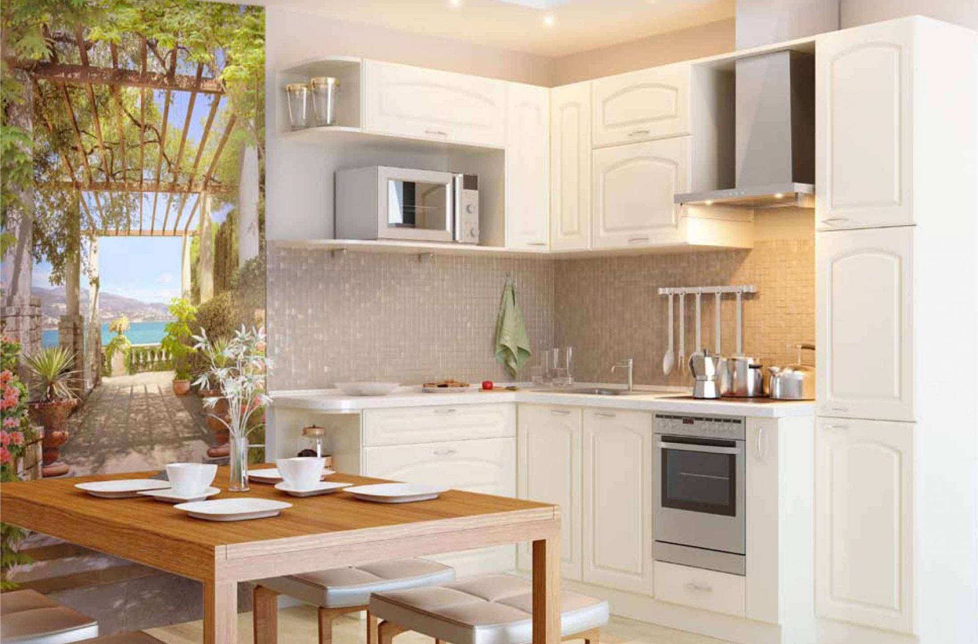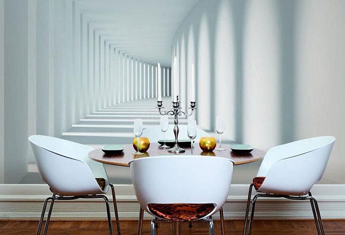 Não há necessidade de ter conhecimento especial no estudo de arte, para entender o papel das ruas representadas na parede: elas alongam visualmente a sala. Estrada pintada que conduz à distância, fascina o olho. Não é de surpreender que as cozinhas com tais papéis de parede sejam o ponto de encontro favorito de toda a família.