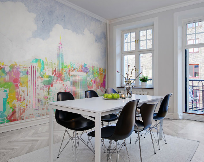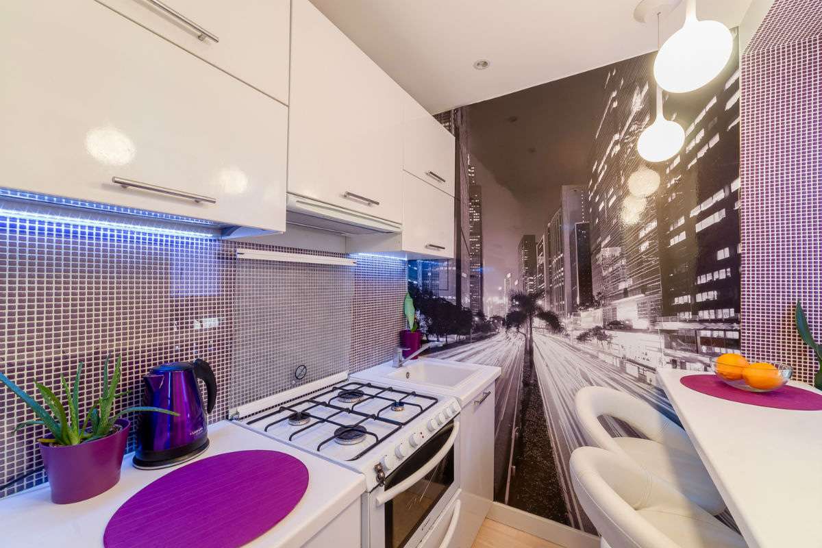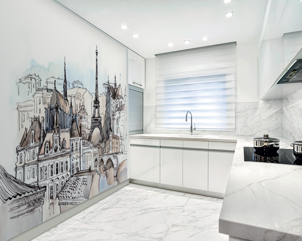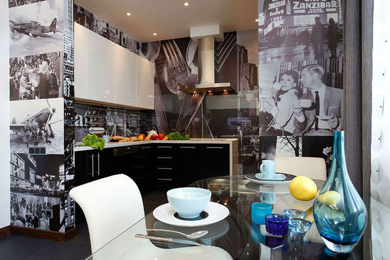 Alguns têm uma ideia diferente de conforto, eles escolhem a imagem de ruas lotadas, pátios. Às vezes podem ser preto e branco, com a imagem das silhuetas das pessoas, refletindo a situação real da cidade. É necessário usar tais opções quando a cozinha é feita em cores retidas, monofônicas, então o padrão na parede não ficará pegajoso.