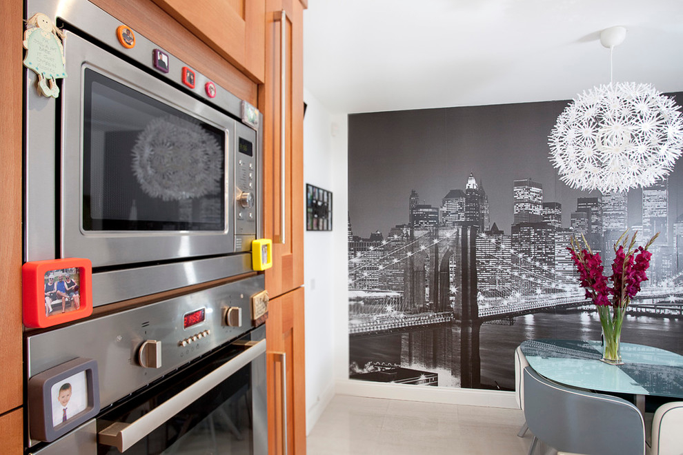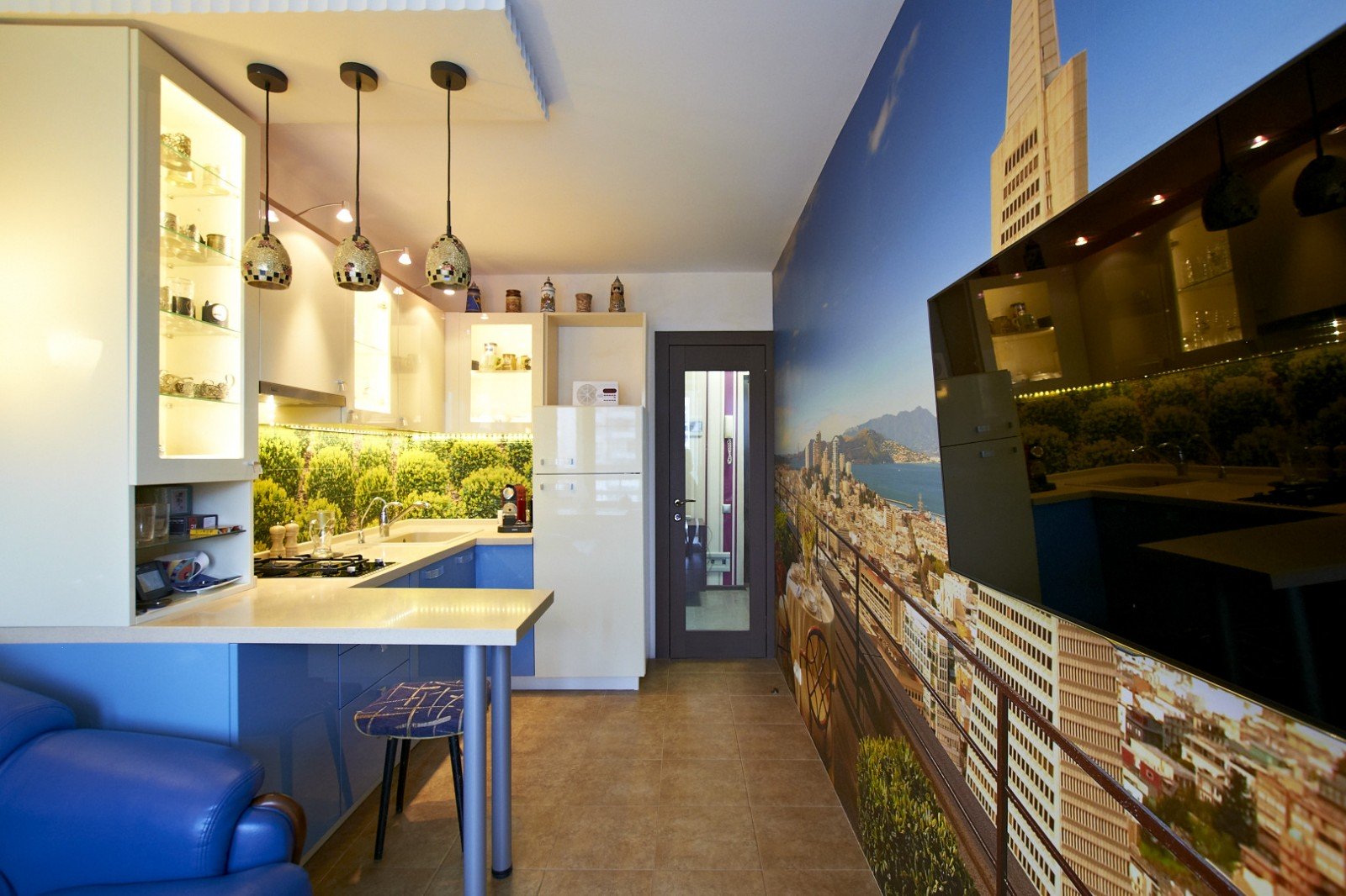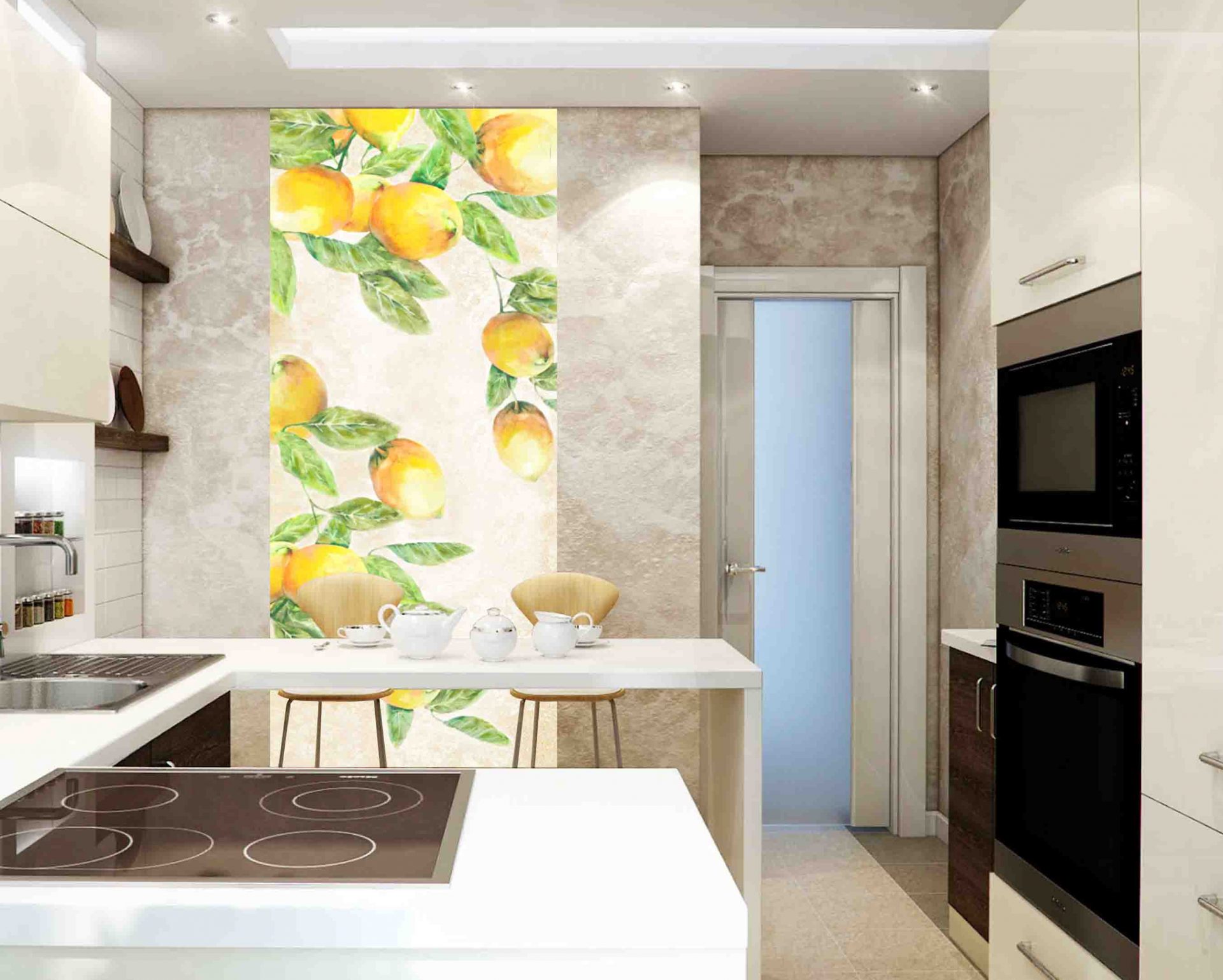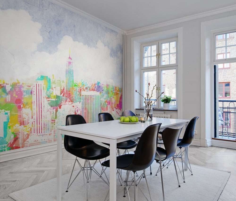 Alguns têm uma ideia diferente de conforto, eles escolhem a imagem de ruas lotadas, pátios. Às vezes podem ser preto e branco, com a imagem das silhuetas das pessoas, refletindo a situação real da cidade. É necessário usar tais opções quando a cozinha é feita em cores retidas, monofônicas, então o padrão na parede não ficará pegajoso.