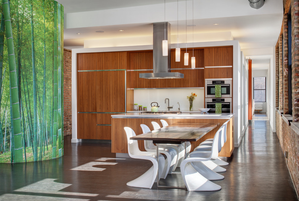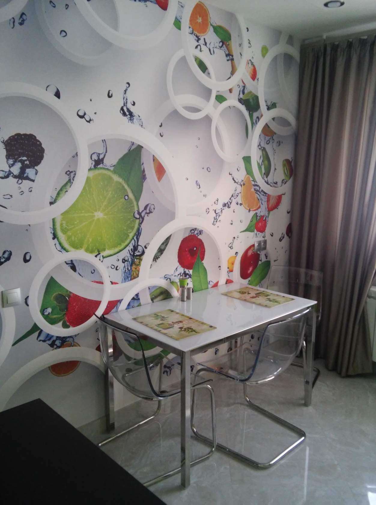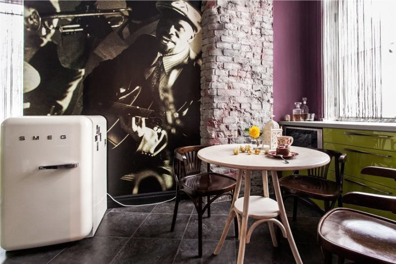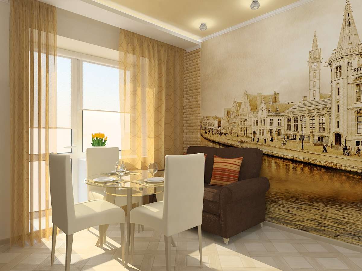 Se o espaço no chão permitir, você também pode usar cores escuras, então quase não há restrições para a escolha de papel fotográfico.. Você pode usar uma das opções abaixo, você pode implementar suas idéias. O principal é combinar os papéis de parede da foto com o design geral de toda a cozinha, móveis, neste caso também da sala de estar.