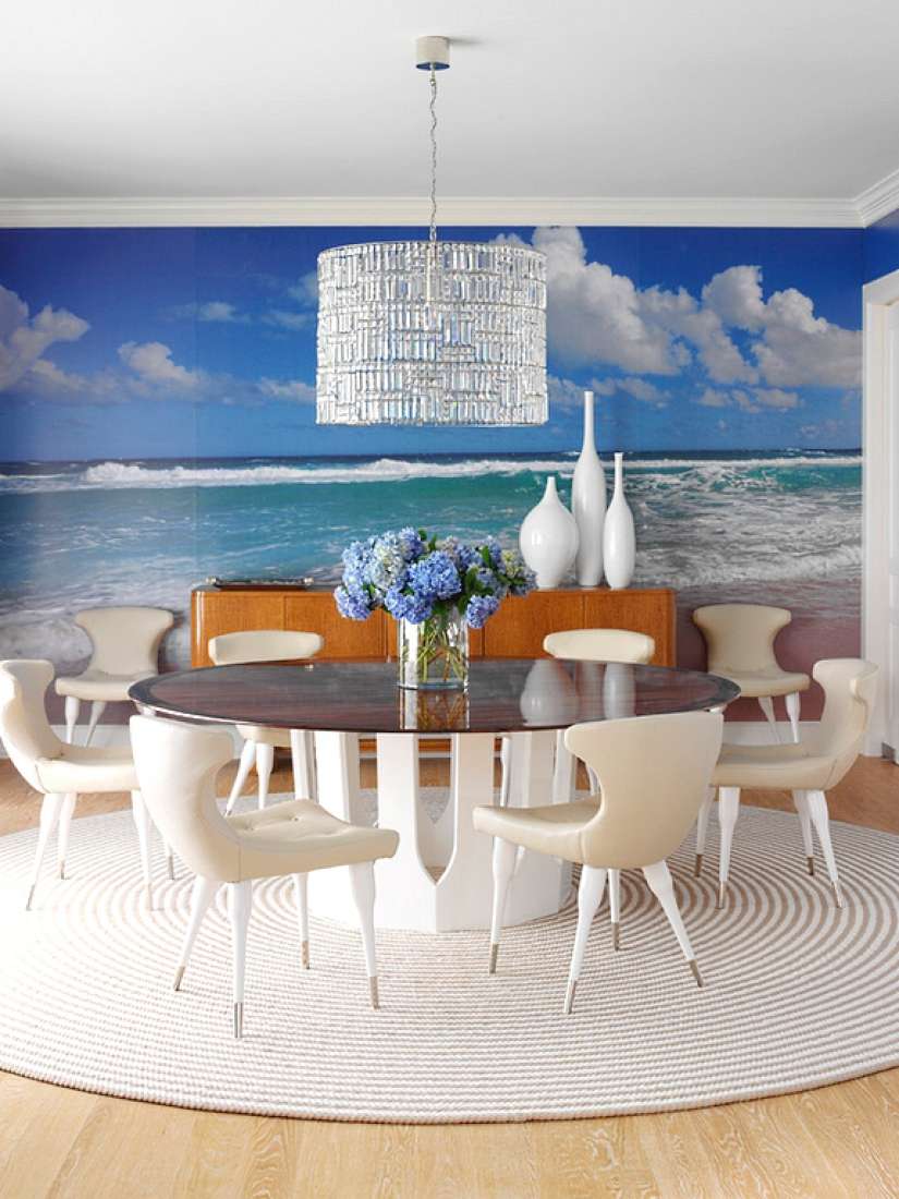 Parece favorável fundindo o topo do papel de parede com o teto, temas marinhos permite que você faça isso. Normalmente, a partir do topo da imagem é visível parte do céu, que pode ser feita no mesmo tom que o teto. O resultado será um efeito de transição suave que expandirá visualmente a sala, tornando-a volumosa.