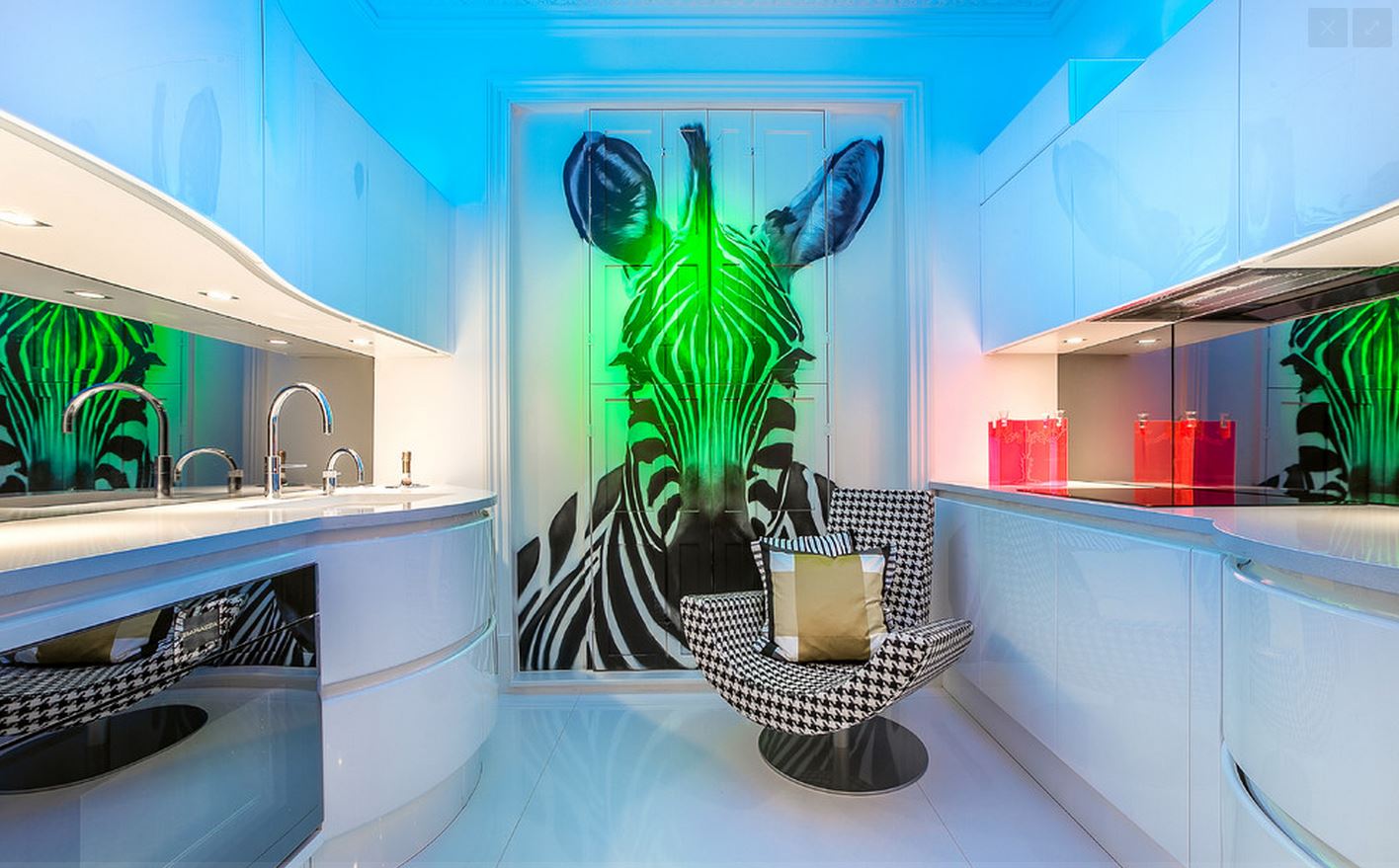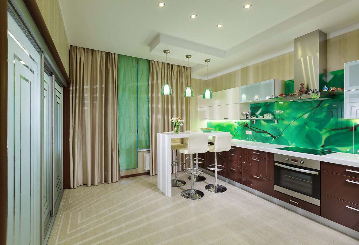 O céu estrelado, imagens do espaço, a megalópole noturna podem ser revividos na parede da cozinha, graças ao uso de iluminação LED ou fluorescente. Algumas pessoas gostam tanto do resultado que decidem usar essa tecnologia em outras salas, especialmente quartos. A luz de fundo da imagem no papel de parede sempre dá a imagem de mistério, mistério.