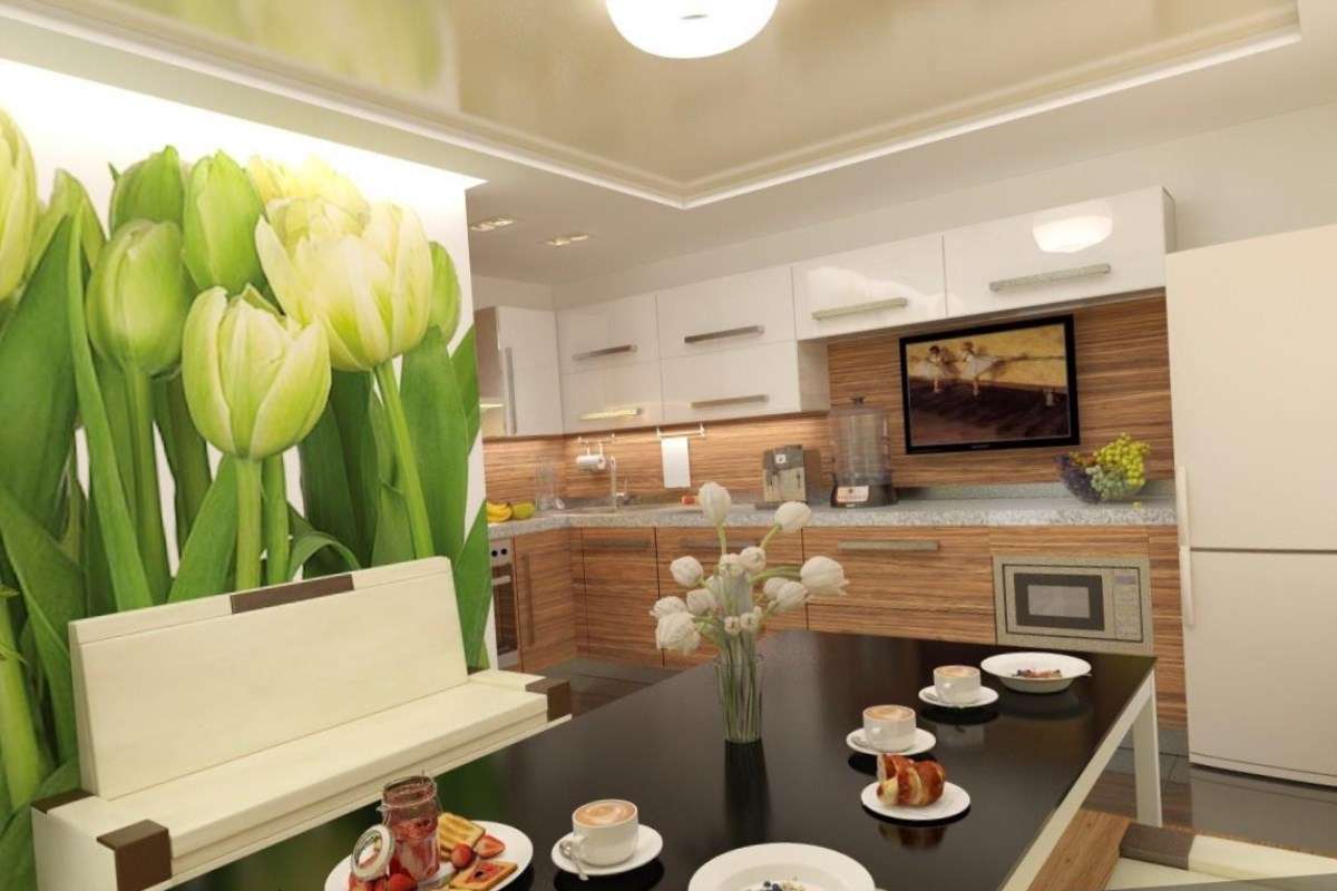 Combinando uma cozinha com sala de estar pode ser encontrado em muitas casas e apartamentos, é freqüentemente usado para o uso prático de duas pequenas salas. Ao projetar uma tal cozinha, a harmonia desempenha um papel especial, porque ambas as salas devem ser feitas no mesmo esquema de cores, estilo e ter uma ideia holística.. Como incorporar a idéia de usar papel de parede de foto para a cozinha em tal situação?