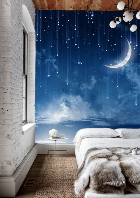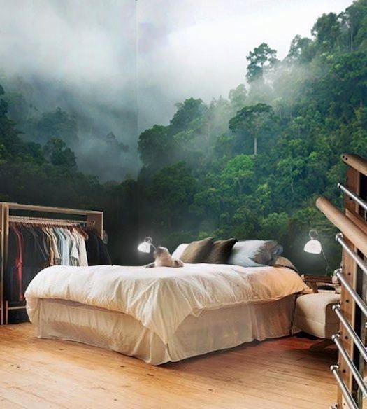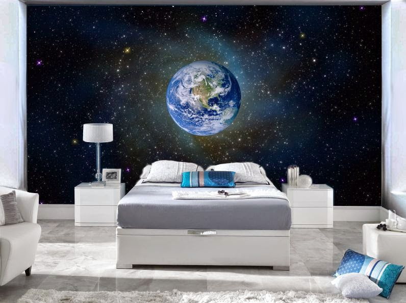 - Eles criam uma atmosfera de espaço. A área da parede com um fragmento da imagem da foto selecionada pode melhorar o interior mais simples.