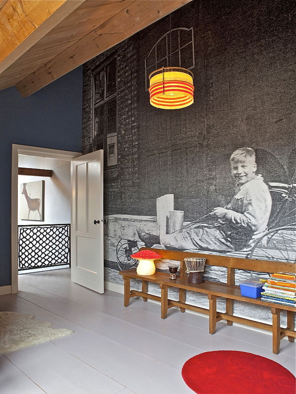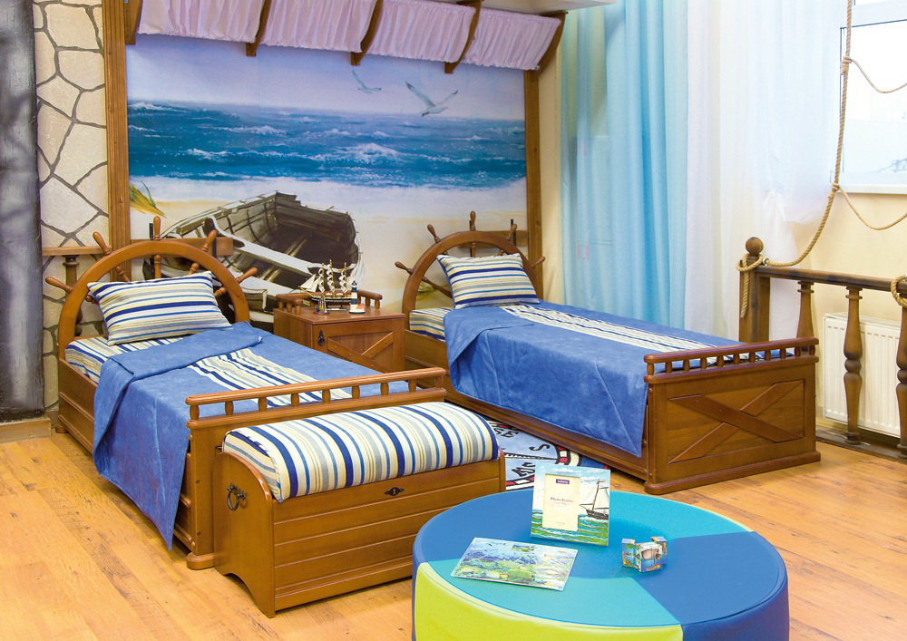 Nesta sala você pode colocar uma imagem de foto não só na parede, mas também no teto. Cenas espaciais, uma visão de um céu azul com nuvens ou uma estrela são bem adequadas para isso.