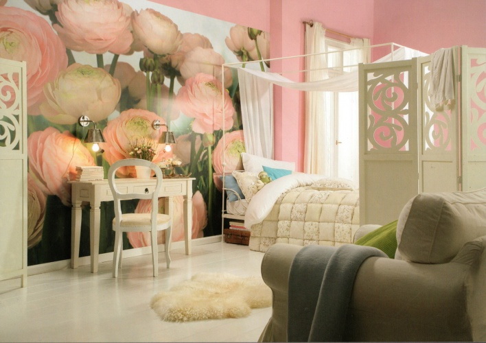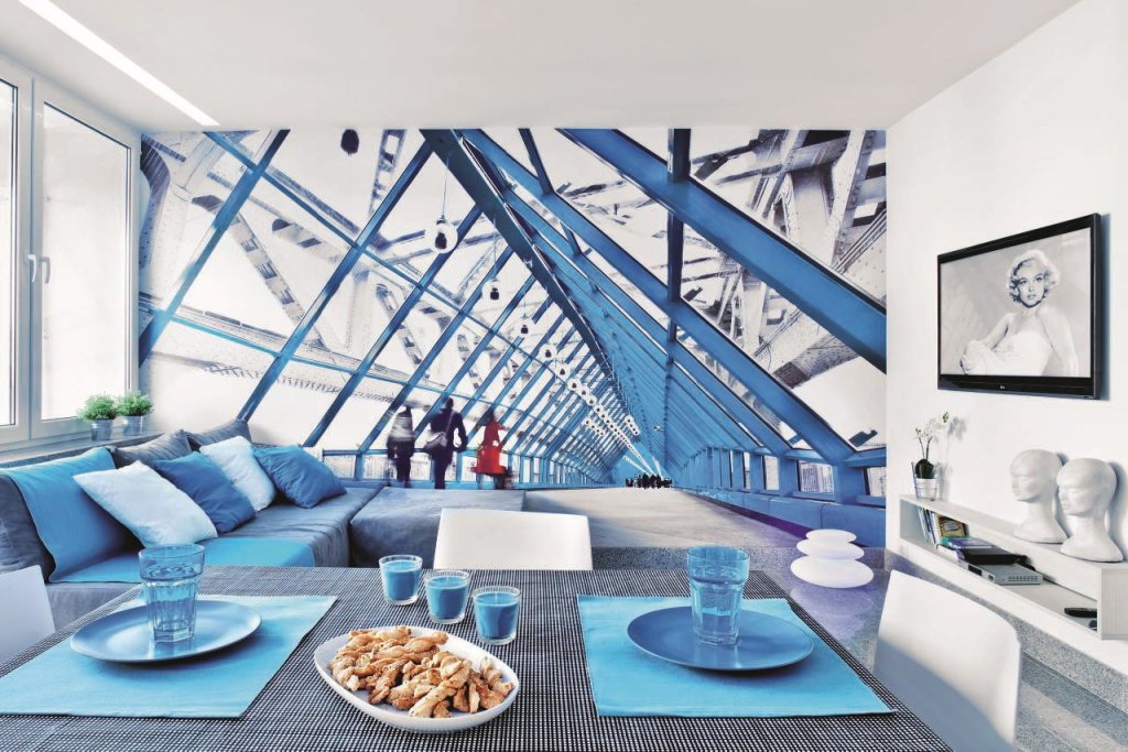 - Um papel de parede com foto é um material versátil que pode decorar não apenas paredes, mas também tetos, bem como qualquer superfície na sala.