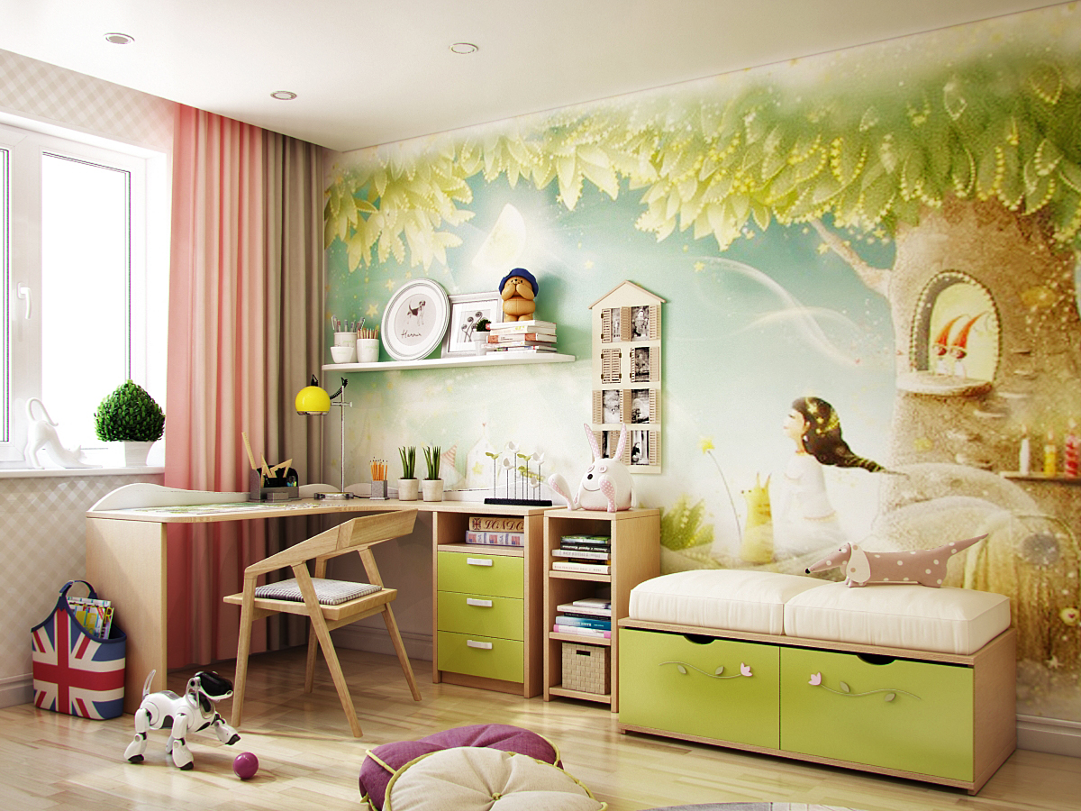 A foto do enredo do assunto deve atender aos interesses da criança. Na tela, você pode colocar os personagens de contos de fadas e brinquedos familiares, complementando-os com a visão da floresta de conto de fadas, uma clareira iluminada pelo sol. Para o desenvolvimento da fantasia, as crianças mais velhas são bem adaptadas ao papel de parede relacionado ao espaço, tramas abstratas não agressivas contra o pano de fundo da cidade da noite e outros temas que a criança prefere.