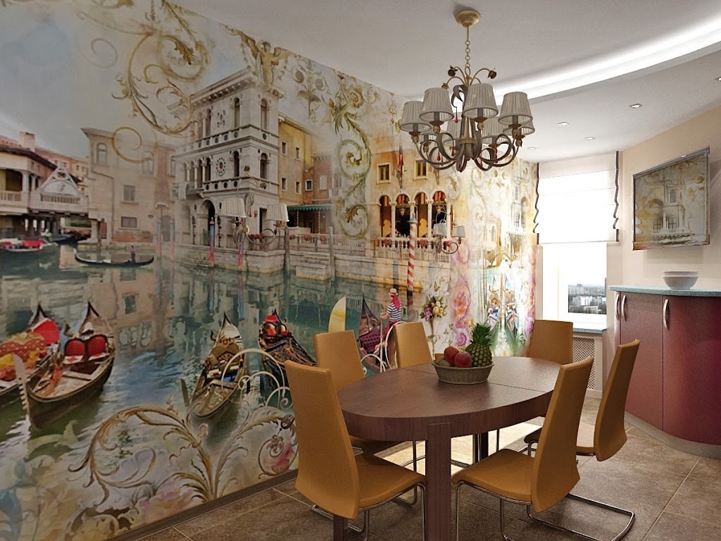 O uso de papéis de parede de fotos para transformação de cozinha é uma técnica de design bem-sucedida. Eles são capazes de dar a este quarto um conforto especial e originalidade. Existem muitos lotes para a cozinha. Este e ampliado imagens de frutas, doces, louças e muitos outros. Classics é o tipo de cestas de alimentos, arranjo de flores com espigas. Tais tópicos contribuem para o apetite e causam um clima de comer.