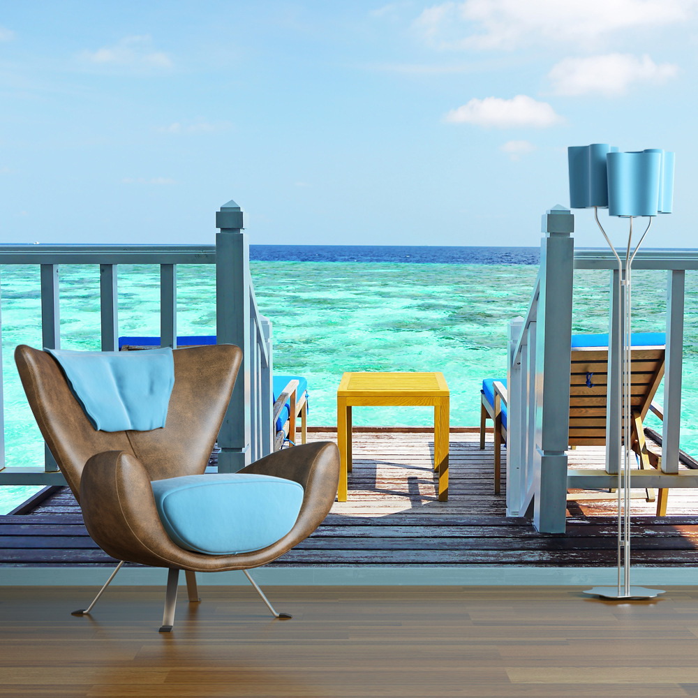- Batota. Imagem realista no fundo da parede com a imagem de uma janela ou portas, lareira ou uma imagem panorâmica do mar, terraços paisagem natural.
