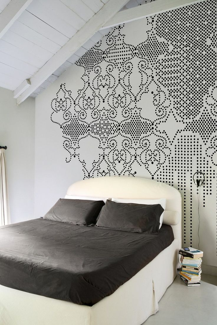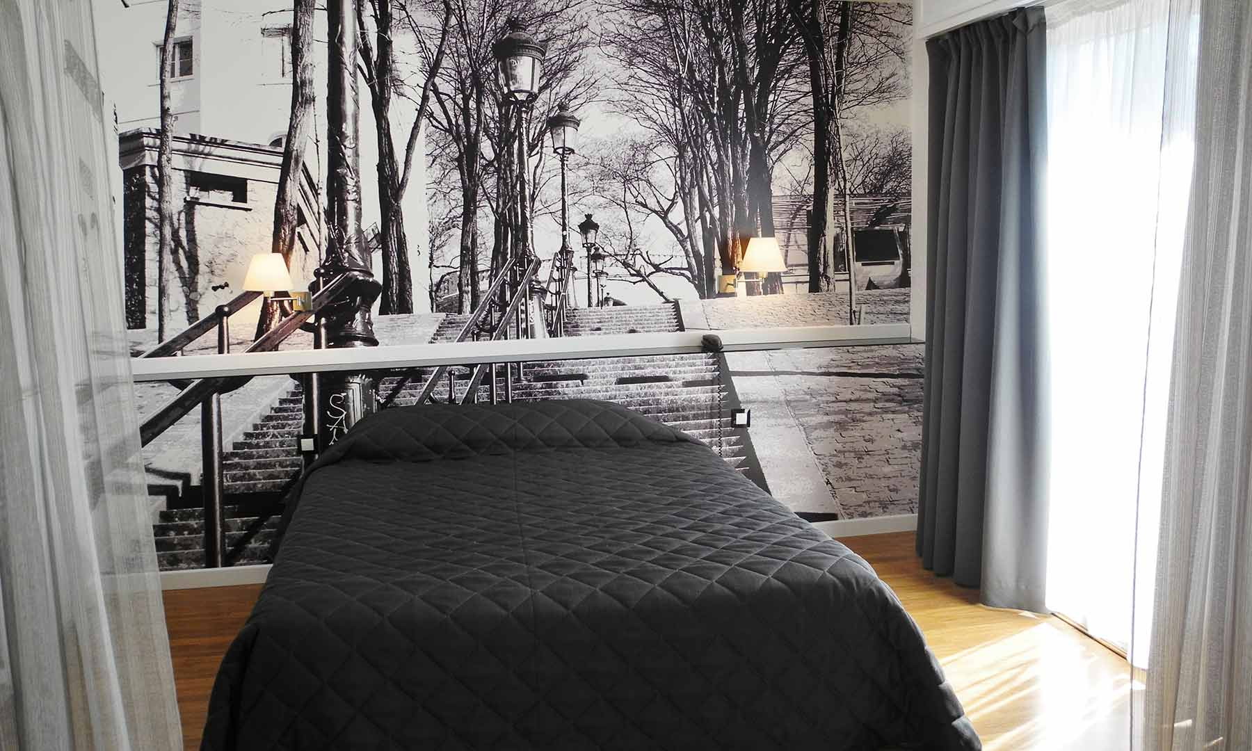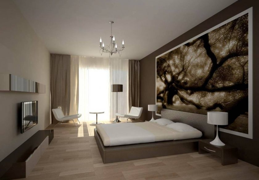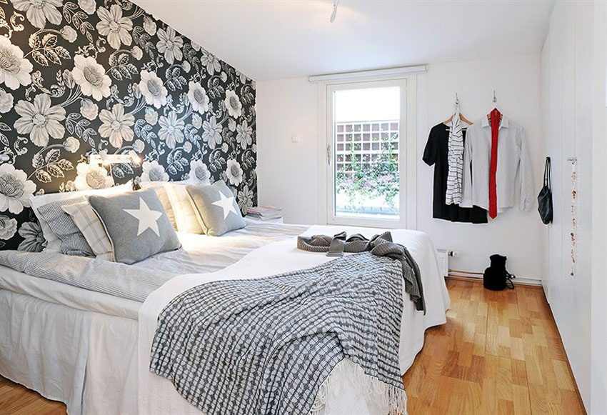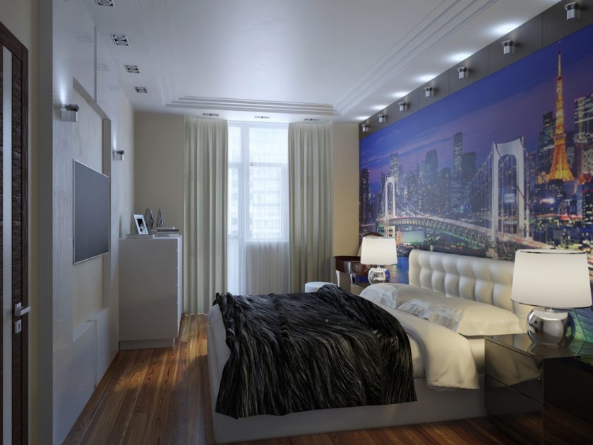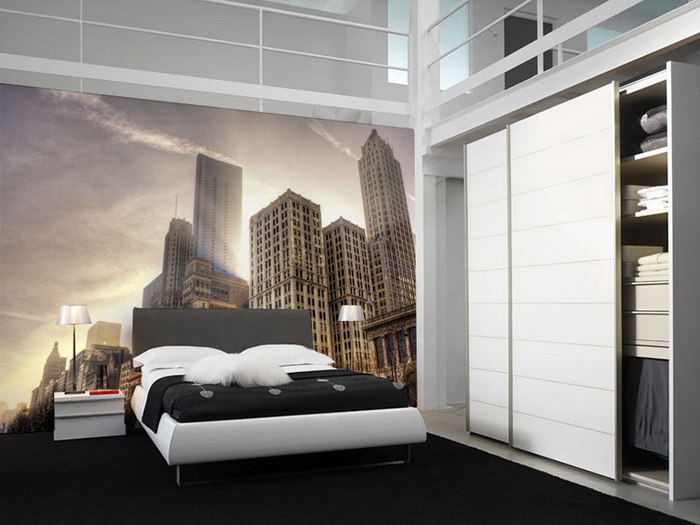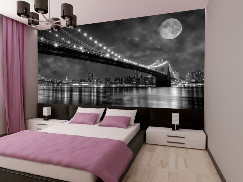 - Original e elegante olhar impressão em preto e branco na parede do quarto. Só neste caso, será necessário dar especial atenção à escolha dos móveis e ao acabamento do fundo principal. Esta combinação refere-se ao contraste, por isso é melhor dar preferência ao monocromático.