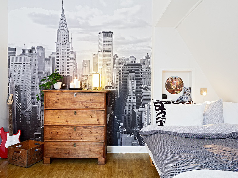 - Alteração visual dos parâmetros da sala. É usado em salas pequenas. Se você colar o papel de parede com a imagem da cidade horizontalmente - você expandir visualmente as paredes, verticalmente - visualmente elevar o teto.