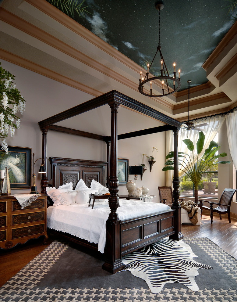 Diversificar o interior do quarto não só pode furar photowall na parede. A variante onde a superfície do teto é coberta com papel de parede fotográfico é elegante, extraordinária e interessante. Estou convencido de que a colagem desta parte da sala com telas de qualidade do tipo: céu estrelado, cosmos ou imagens de flores será uma ordem de grandeza mais barata. Se você os comparar com o acabamento drywall ou lona esticada.
