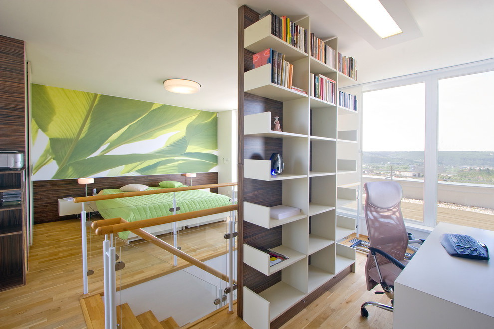 - Divisão do espaço em zonas.Se existem vários quartos, e estamos falando de um quarto, esse método pode ser usado para distinguir entre uma área de dormir e um canto de cosméticos.