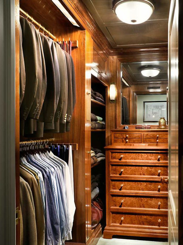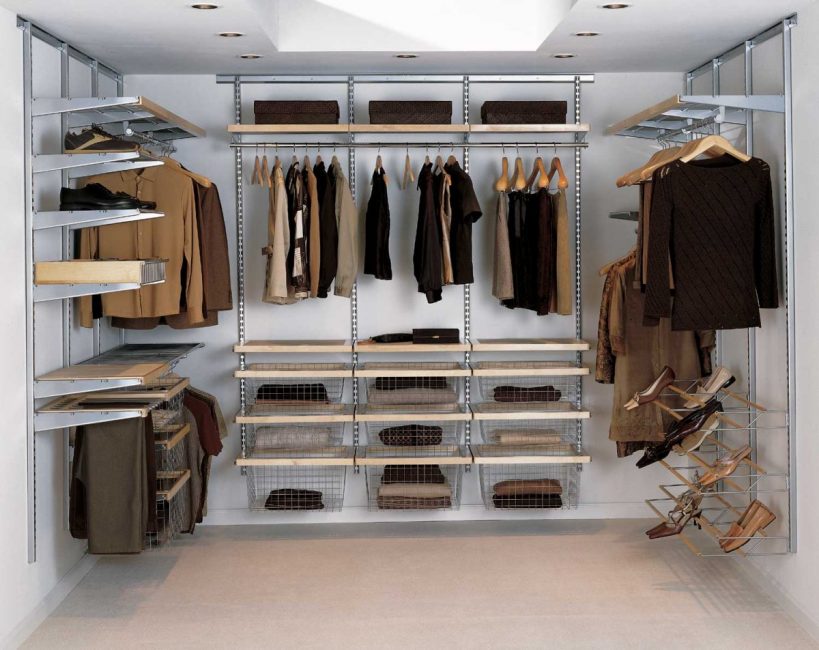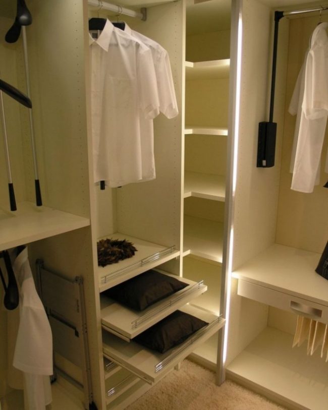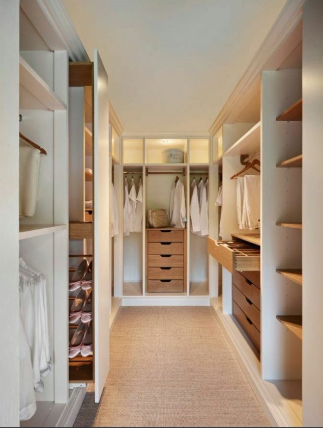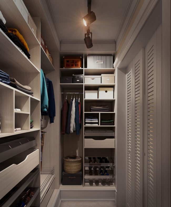 Um guarda-roupa, independentemente de ser embutido ou clássico, deve ter um arranjo funcionalmente projetado de prateleiras, gavetas, cabides para roupas, etc. As caixas devem ser colocadas na parte inferior zona, a uma distância de 120 cm do chão, para ver isso neles. Um guarda-roupa pode ser curto e longo, dependendo da duração das coisas. Basta instalar camisas, calças, jaquetas, blusas em um armário de 90 a 100 cm de altura ou criar dois andares com cabides - um acima do outro.