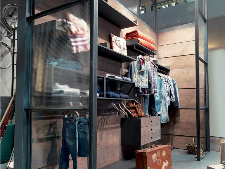 Você pode encomendar este projeto no salão de móveis, depois de especificar o tamanho desejado. Então só irá coletar tubos. Assim, não apenas guarda-roupas, mas também stands de exposição, prateleiras para escritórios e muito mais são montados.