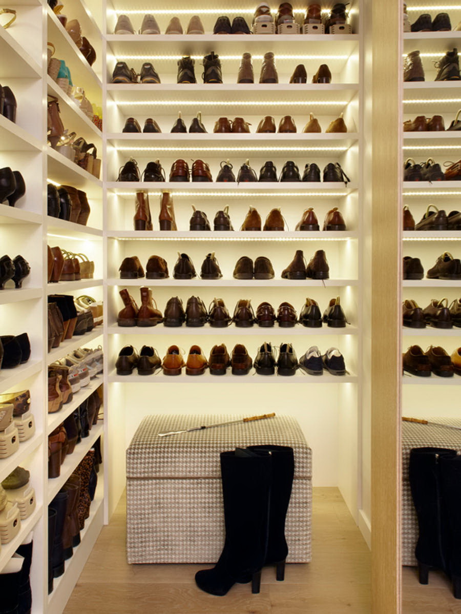 A sapateira pode ser simplesmente uma prateleira padrão virada de cabeça para baixo com suportes angulados para facilitar o acesso ao sapato.