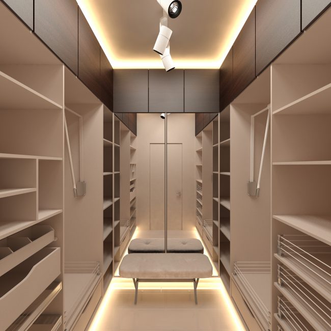 Esta parte do apartamento vai apelar a todos os membros da família, não só para escolher uma roupa e acariciá-lo lá, mas também para se aposentar por um tempo. É o suficiente para colocar uma cadeira confortável e uma lâmpada no vestiário.