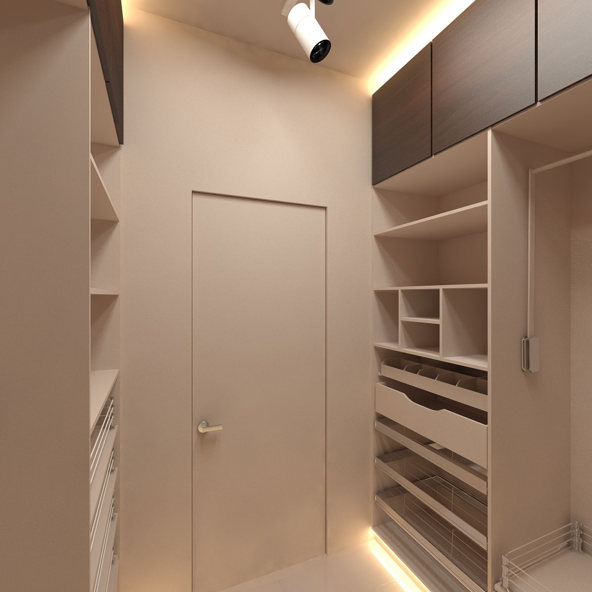 O camarim não será menos atraente se for feito de acordo com outro plano. Para criar um novo espaço funcional a partir da sala de armazenamento, é necessário fazer um desenho e atualizar o desenho das superfícies internas das paredes. Vale a pena reparar tecto. Você pode fazer o guarda-roupa aceso e a fiação interna.