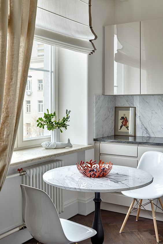 Outra ideia simples para o design da janela da cozinha. Eles se originaram em Viena em 1800 em cafés de rua, onde se tornaram um símbolo de facilidade dentro da instituição.