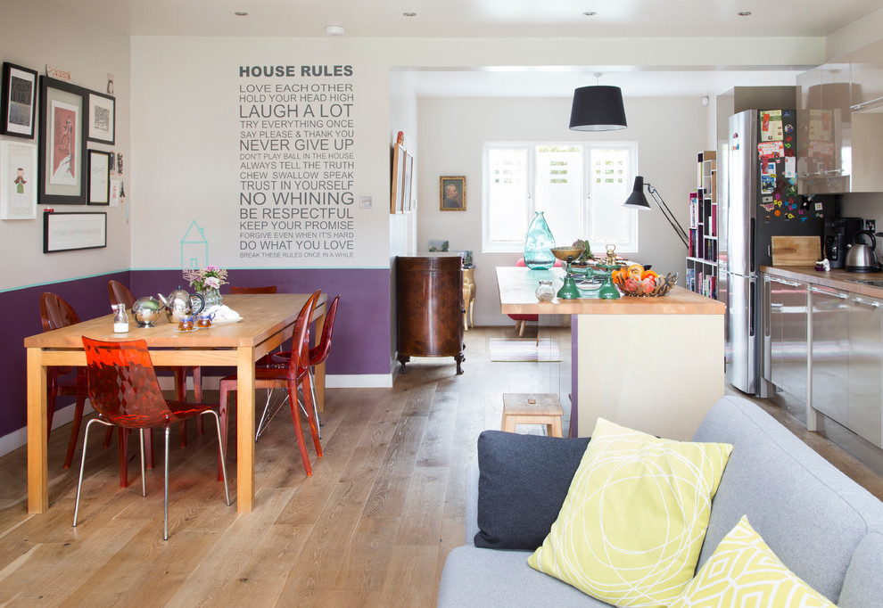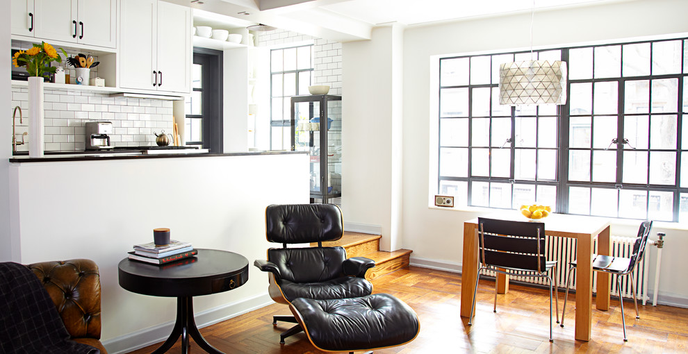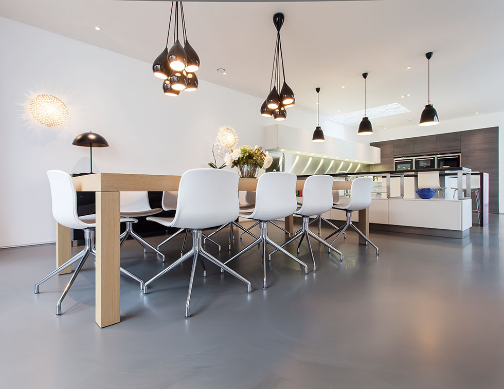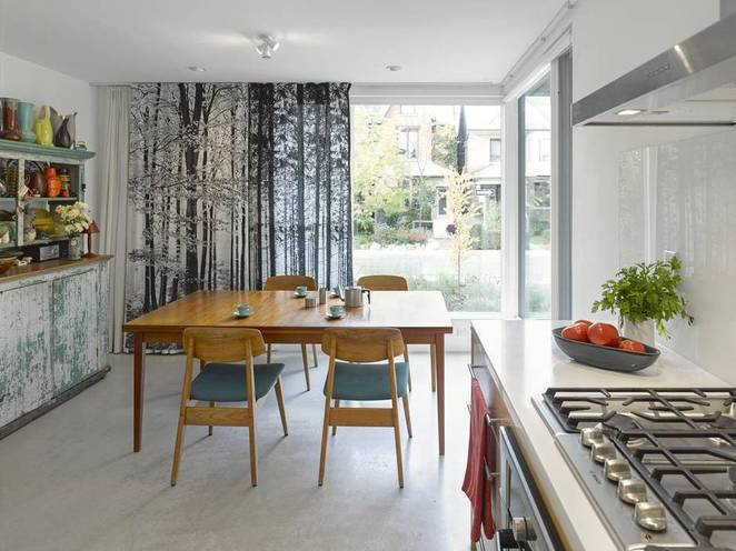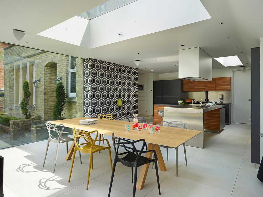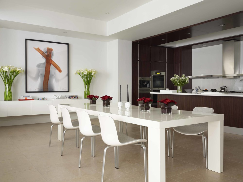 Ou a cozinha, onde o design estrito é combinado com uma área de jantar extremamente suave e amigável.