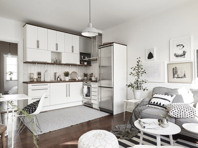 O design mais eficaz é a cozinha em forma de L. Aqui, duas paredes adjacentes formam um triângulo natural.