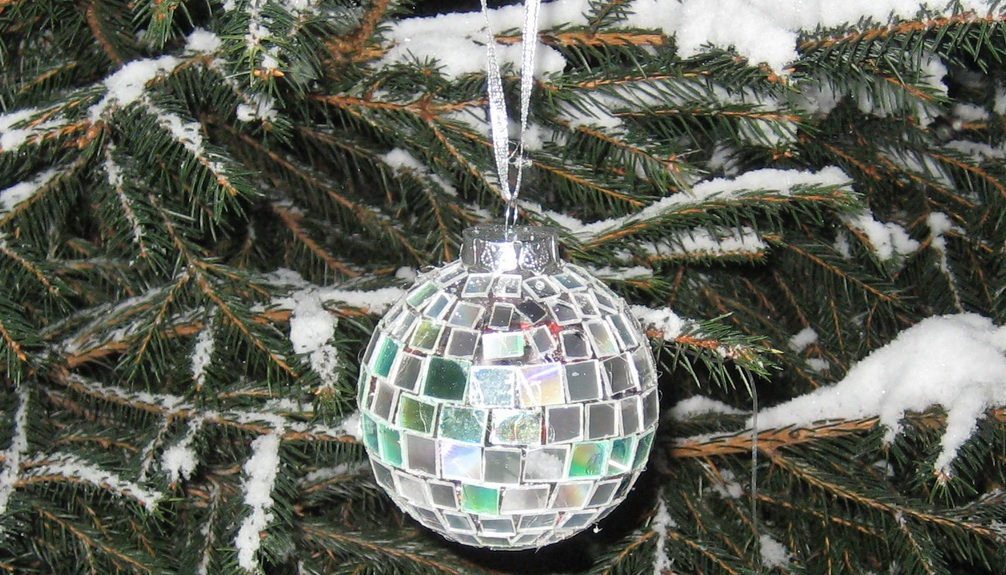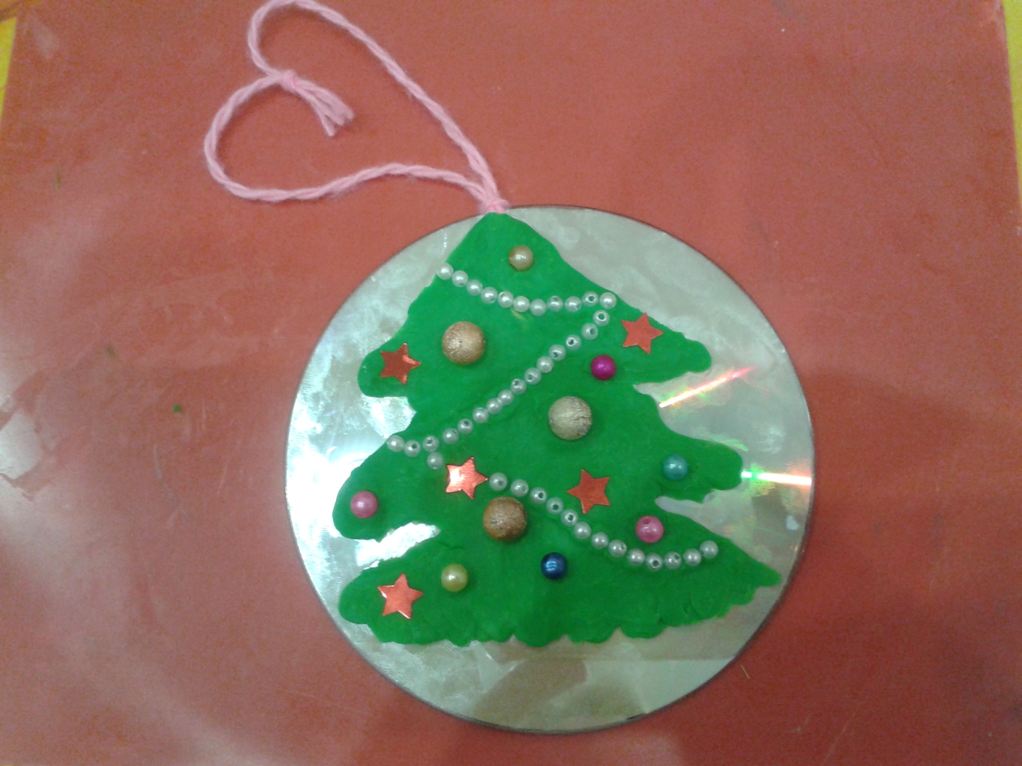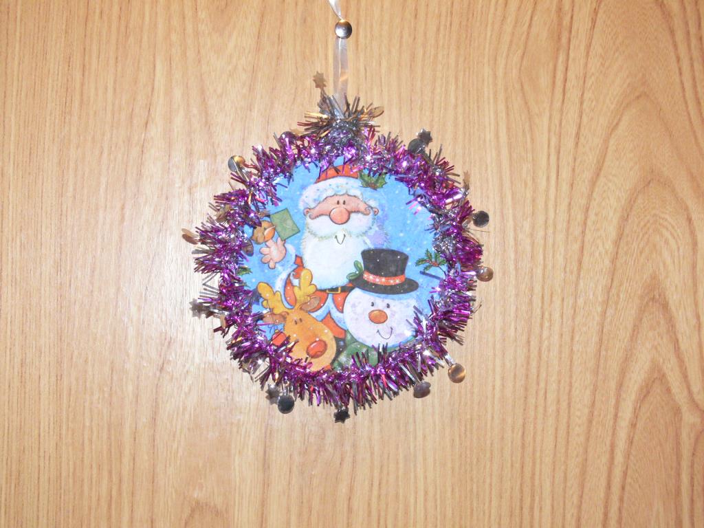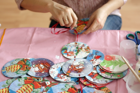 Corte os discos com uma tesoura em pequenos pedaços, triangulares e em forma de losango. Cole os objetos cortados na superfície do brinquedo de Natal com uma pistola de cola. O artesanato está pronto.