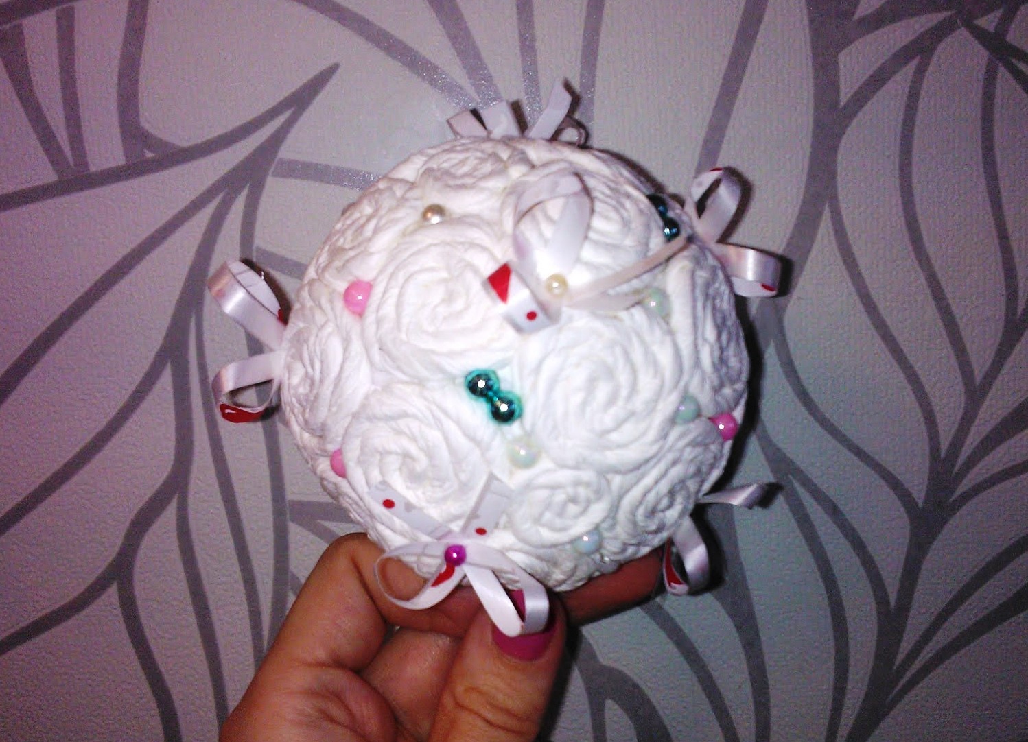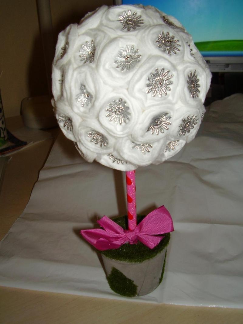 - De uma fita nós fazemos um arco.A corda é torcida em um loop, colada com uma pistola de cola junto com um arco no topo da nave.