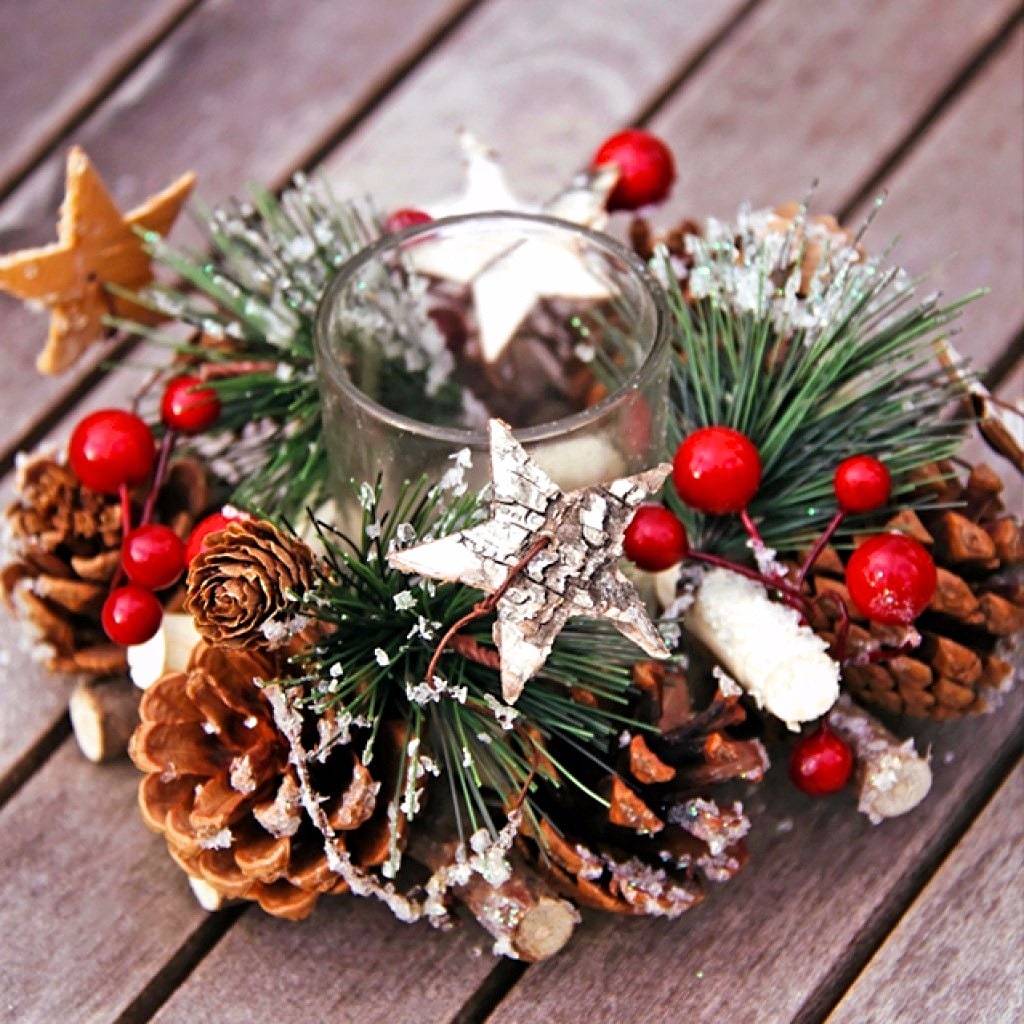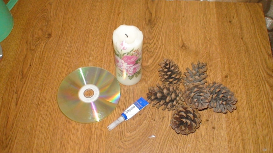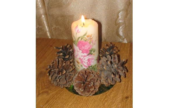 No centro do produto com cola de borracha, cole a panela de alumínio sob a vela. Para ele em um círculo anexar com cones de abeto laca secas de cola. Nós decoramos a superfície livre do artesanato com strass, brilhos e seixos decorativos. O candelabro está pronto, você pode seguramente colocar uma vela nele.