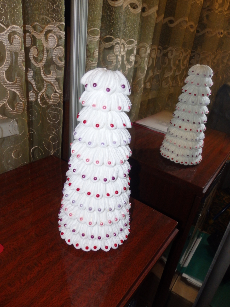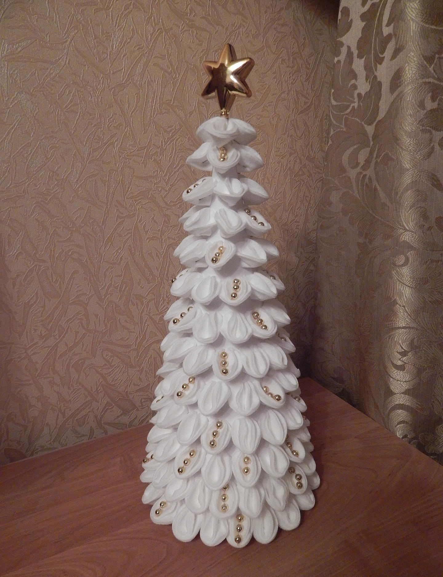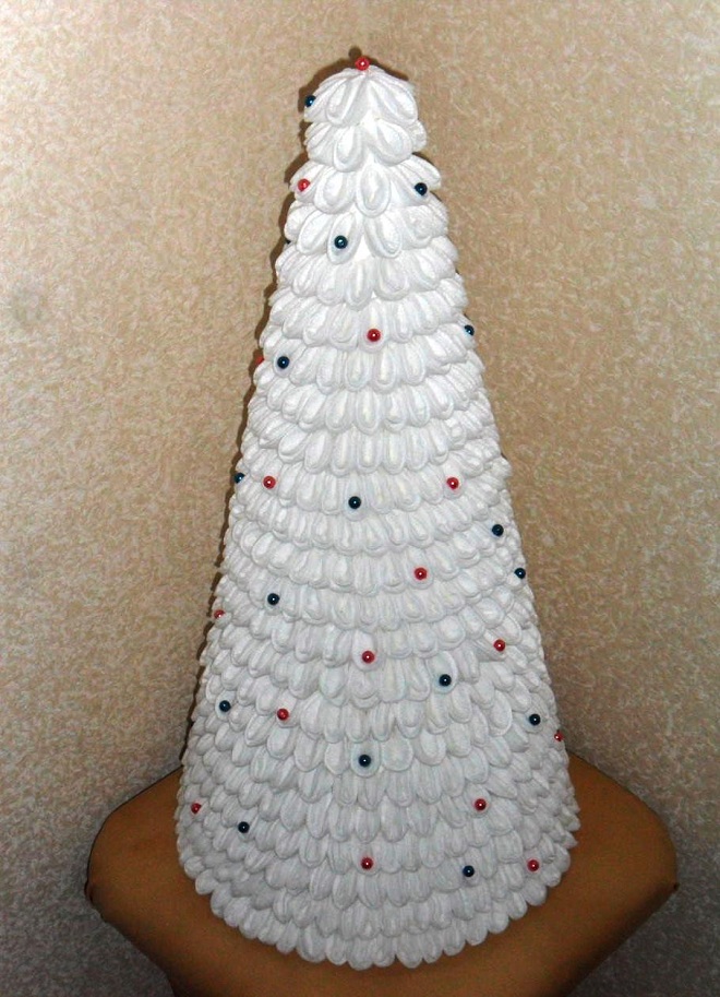 Colamos o maior cordão no topo da árvore de Natal resultante. O resto das contas decoram toda a árvore de Natal.