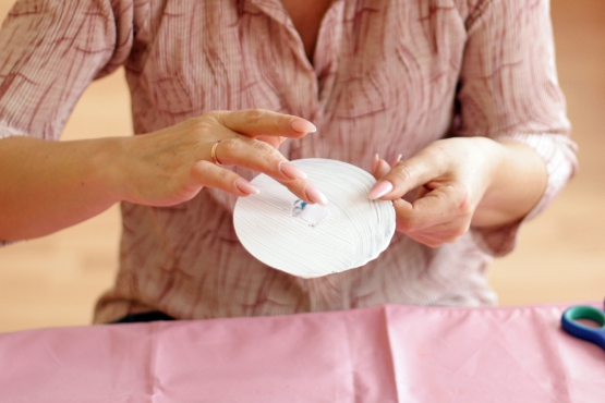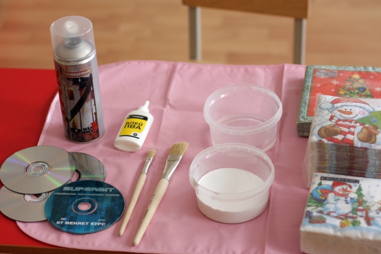 - Corte um padrão, um desenho ou um círculo um pouco menor que um disco de um guardanapo. Cubra com cola branca, cole um guardanapo. Para alinhar a superfície, aplique uma toalha ou pano macio na superfície, alise as dobras.