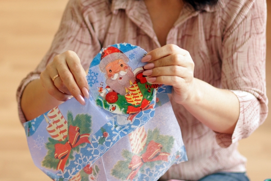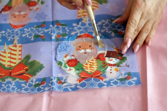 Alternativamente, em vez de guardanapos, você pode imprimir qualquer padrão de Natal em papel comum, mas eu recomendo guardanapos, eles são melhor colocados na superfície de trabalho.